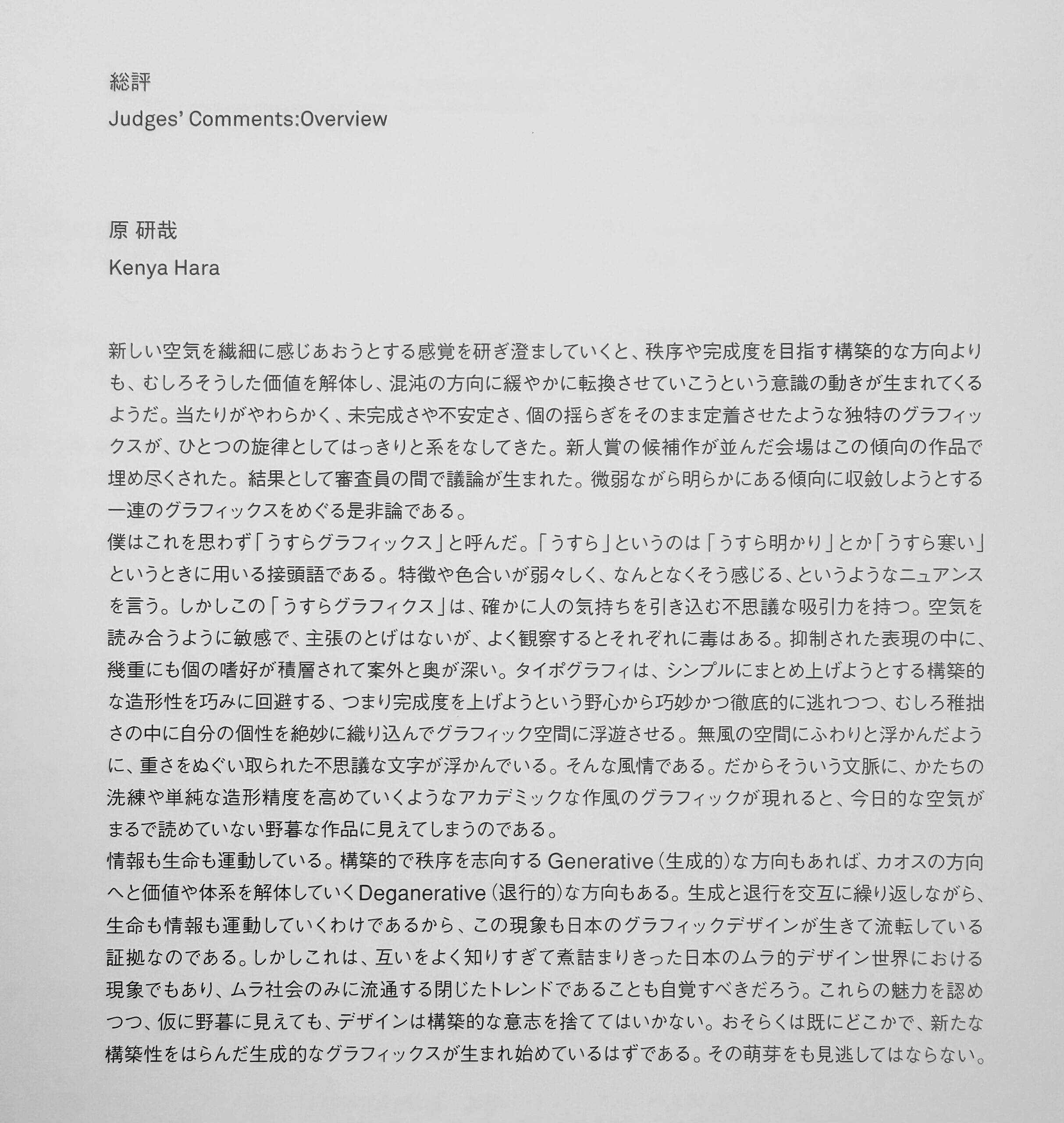 原研哉さんが2012年のJAGDA賞の総評として書かれた言葉。Web文化とコピーライティングで、望月さんが書かれていたことと通ずるところがある