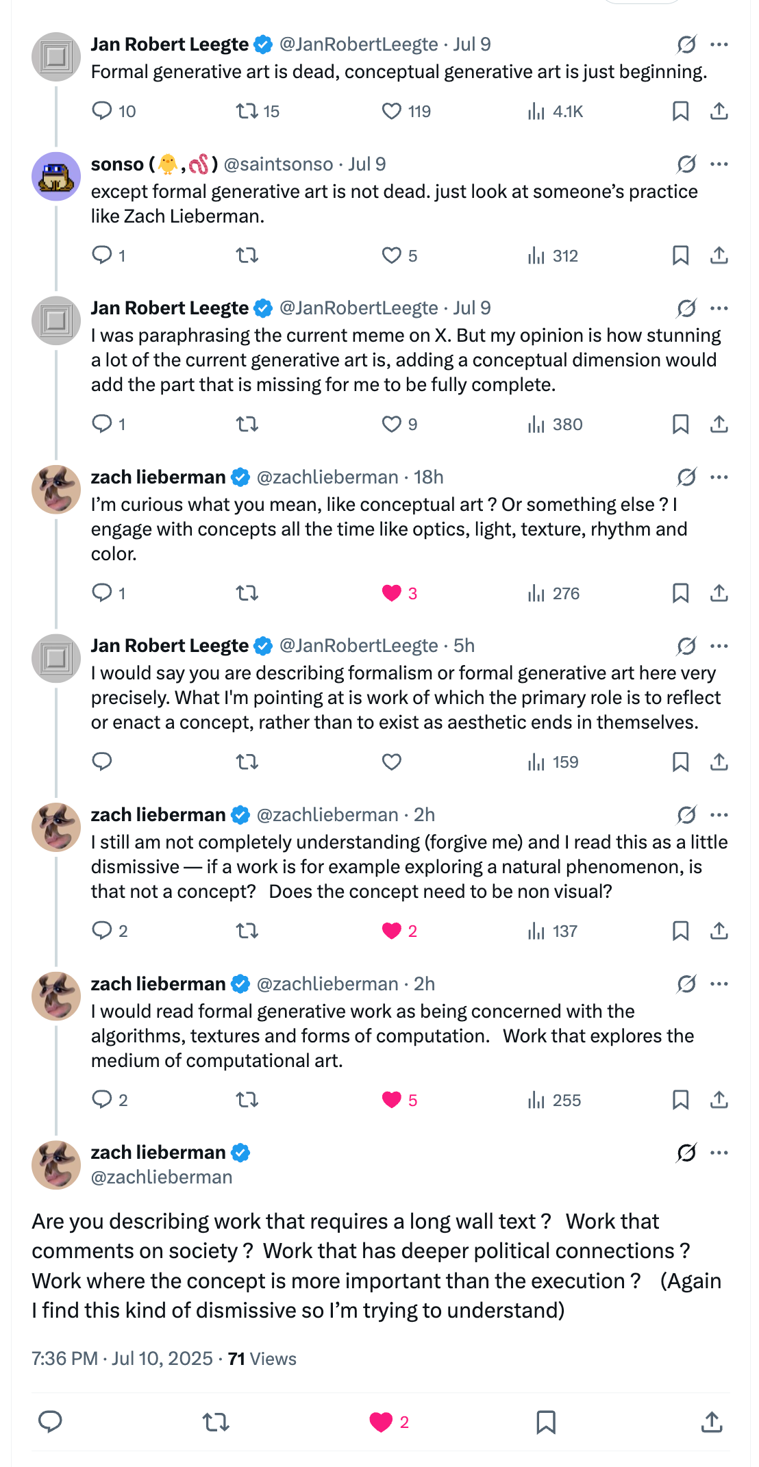 @zachlieberman: A funny thing about botto / @quasimondo is that he is one the artists I truly admire but blocked because early on when I was sketching he kept responding to my sketches with some example of something similar he had done in the past. I ask him politely to stop and he didn’t.. I felt like it was some weird energy to be told all the time “I did that first”. It’s funny that someone so concerned with authenticity and precedent makes this project that looks so derivative / like intro textbook material