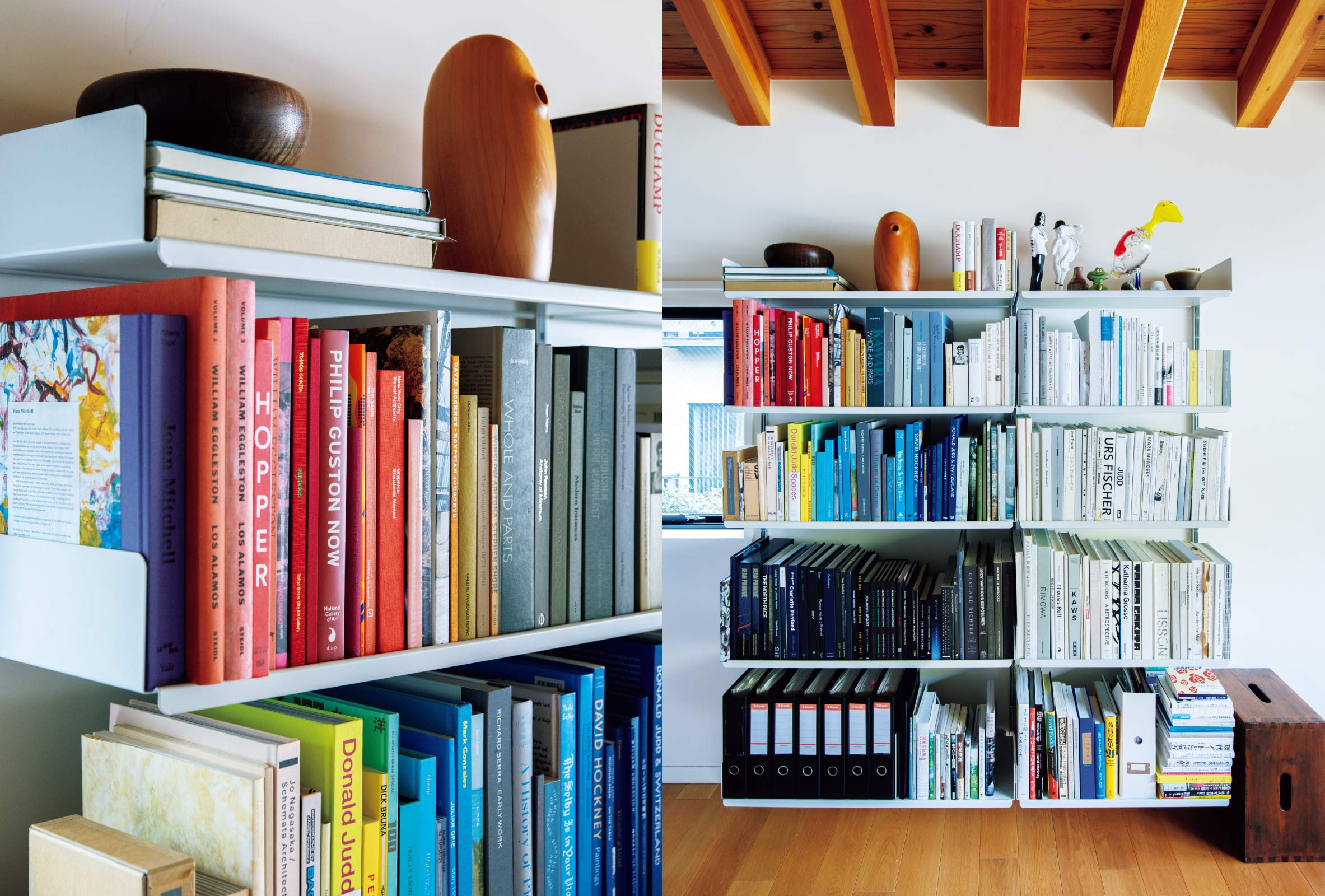 • 壁付けの棚は〈ヴィツゥ〉製。写真集や画集はカバーを外し、色で分けて並べている。本の“素”の状態を収めて景色をつくりたいという考えからだ。