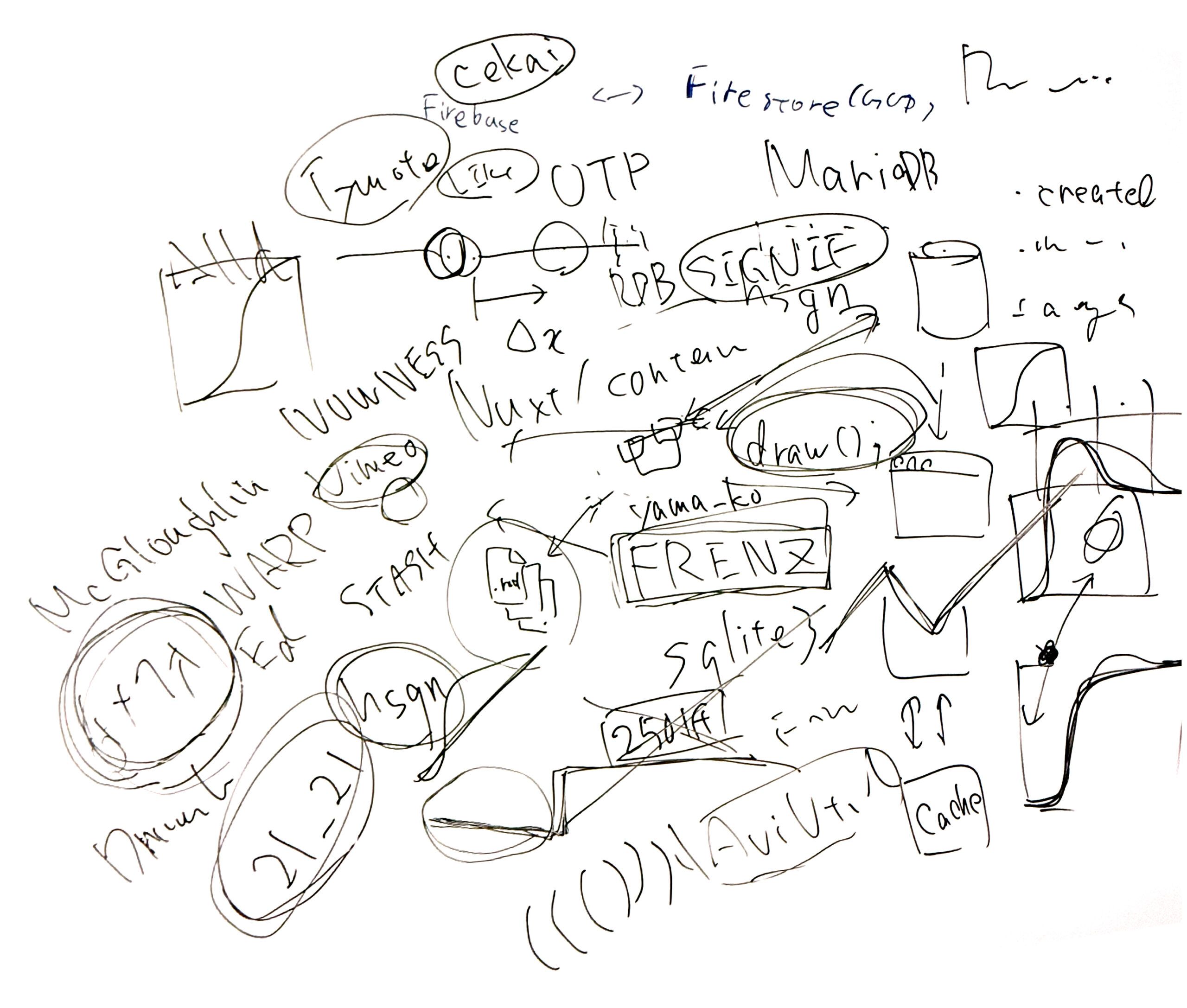 Vue Fes Japan 2025マクトクさん、Yuito Fujiwaraさんとローカル・ファーストなCMSシステムについて話し合っているつもりが、何故か描き上げていた謎の図。