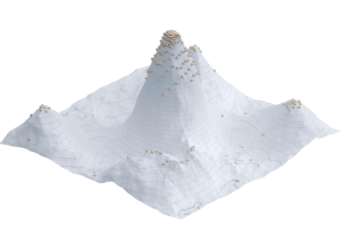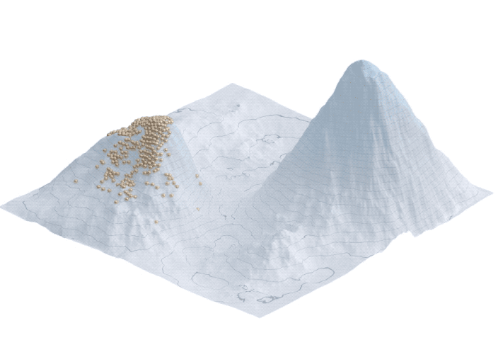 この地形の緯度経度は、調整可能な特徴や形質、その地点での高さはよさの視覚的なメタファーを表現しています。地形の上を駆け回るつぶつぶは、よさの追求に明け暮れる個です。よさの定義は文脈によって変わります。生物の環境への適応、デザインにおける品質、企業の生産性など。つぶつぶが意味するものも、よさの定義によって変化します。先の例でいうと、順に生物個体、デザイナー、法人などが当てはまるのでしょうか。