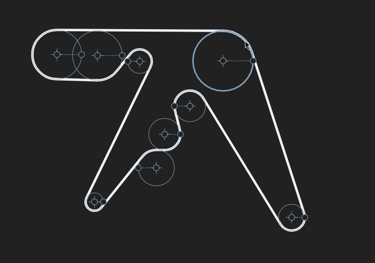 とかいうとデザイナーの方は、なんか一部の物好きなプログラマーっぽい奴らしか関係なさそう、自分らには Figma や Illustrator で十分だ、とか思われるかもしれませんが、この機能は実はみんなにとって嬉しいやつです。テオ・ヤンセンみたいなリンク機構からなるモーショングラフィックスも作れます。Aphex Twin のロゴのような、多分イラレでやると死ぬグラフィックもめっちゃパラメトリックに組んで、しかも直接形をいじくりまわして調整することができます。円グラフも書きやすくなるのでプレゼン資料にも便利かもしんないです。