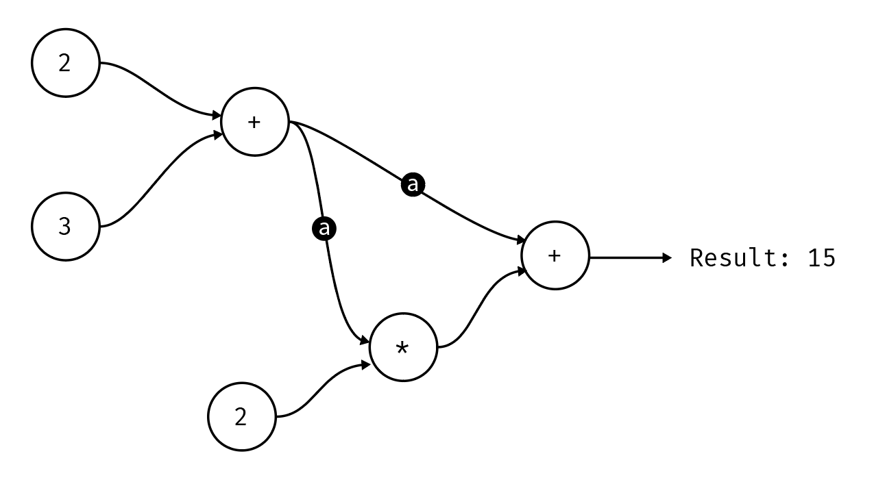 先の例のconst a = (2 + 3); (a + (a * 2)) は、グラフ構文ではこうなります。