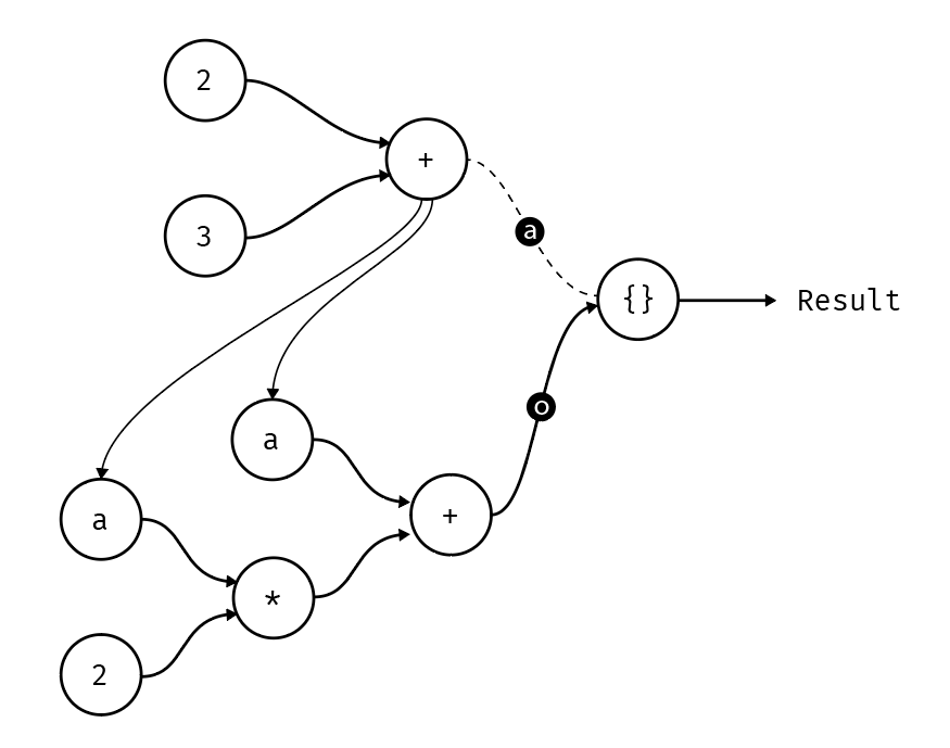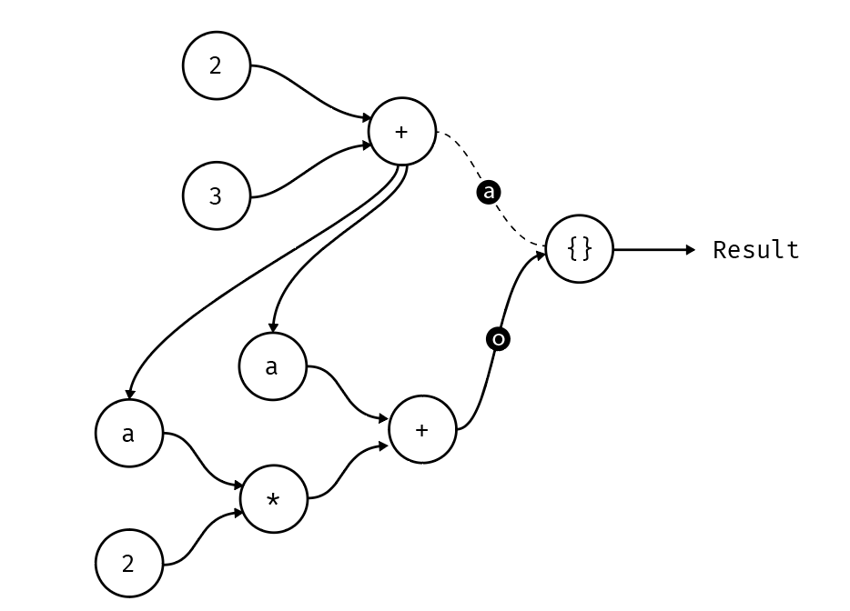 シンボル a をノードとして残しているのは、PDG 全体を構文木のスーパーセットにするためです。(* a 2) にはあくまで (* (+ 2 3) 3) という展開後の式ではなく a というエクスプレッションと 2 の掛け算として GUI 上に表示されていてほしいですよね。また、UI 表示上の都合だけではなく、常に PDG 全体が文字列のコードへと変換され得ることを保証するためにも a というシンボルは残してあります。