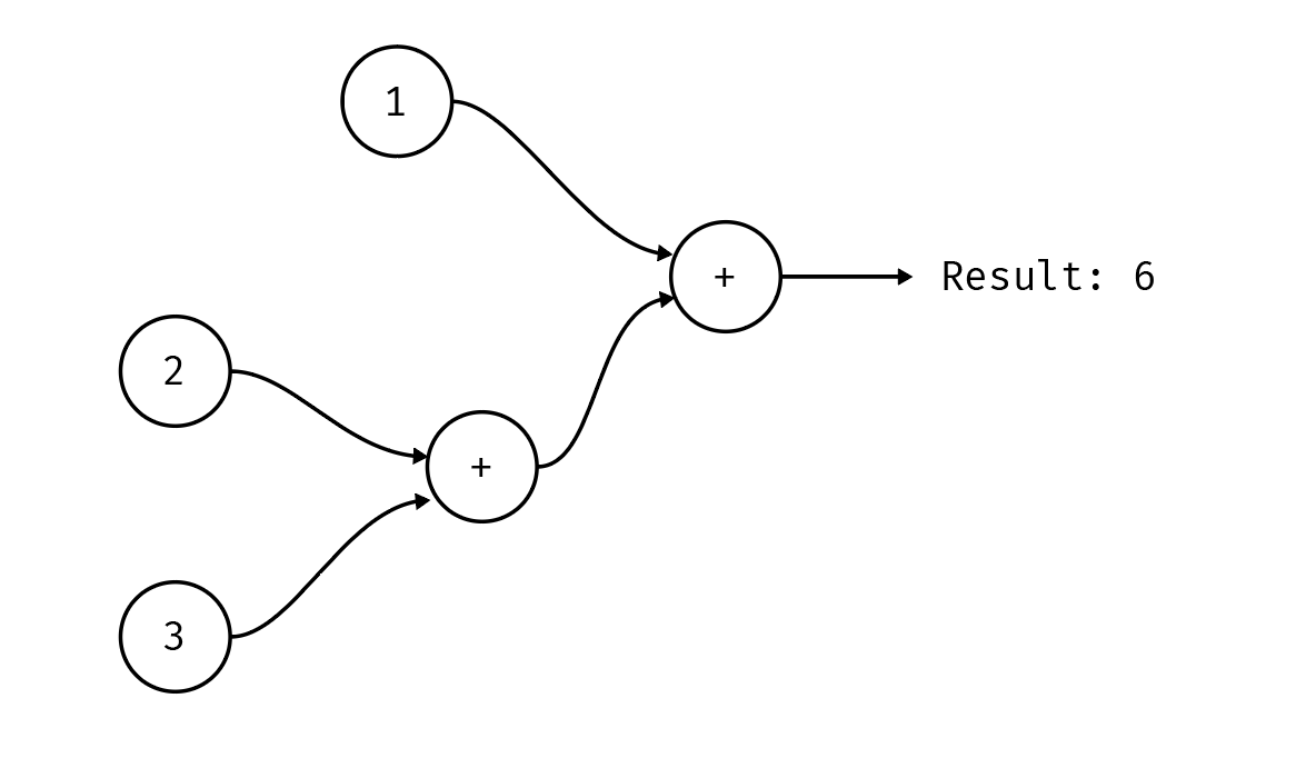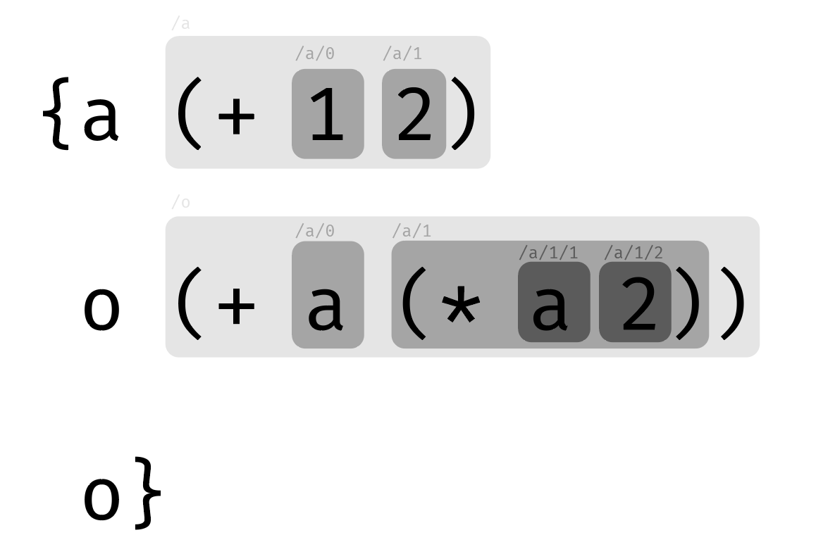 ここで考え直したのが、プログラミング言語における「シンボル」の意味です。コードは「手順」を表すこともありますが、より抽象的に捉えるとデータ同士の結合の仕方を表した有向非巡回グラフ構造でもあります。例えば以下の式