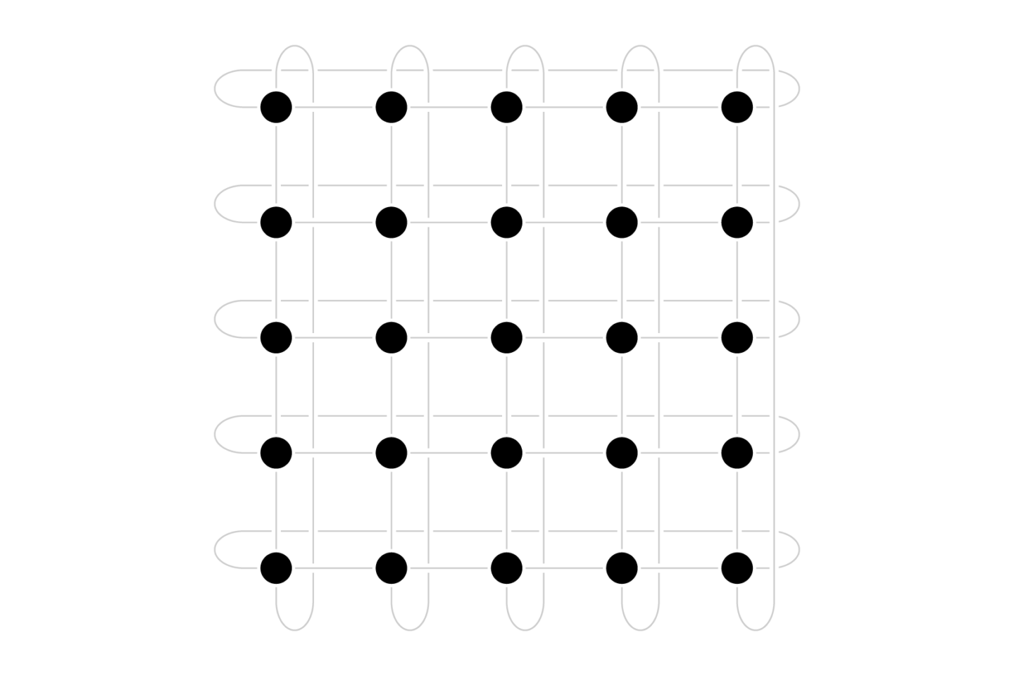 もちは格子状に配置されていて、それぞれ上下左右に 1 つづつ動くことができます。もちの場所を黒丸で表し、移動できる場所同士を線でつなぐとこんなグラフになります。今回の Web サイトでは上下左右がタイル状に反復しているので、両端の黒丸同士も繋がります。