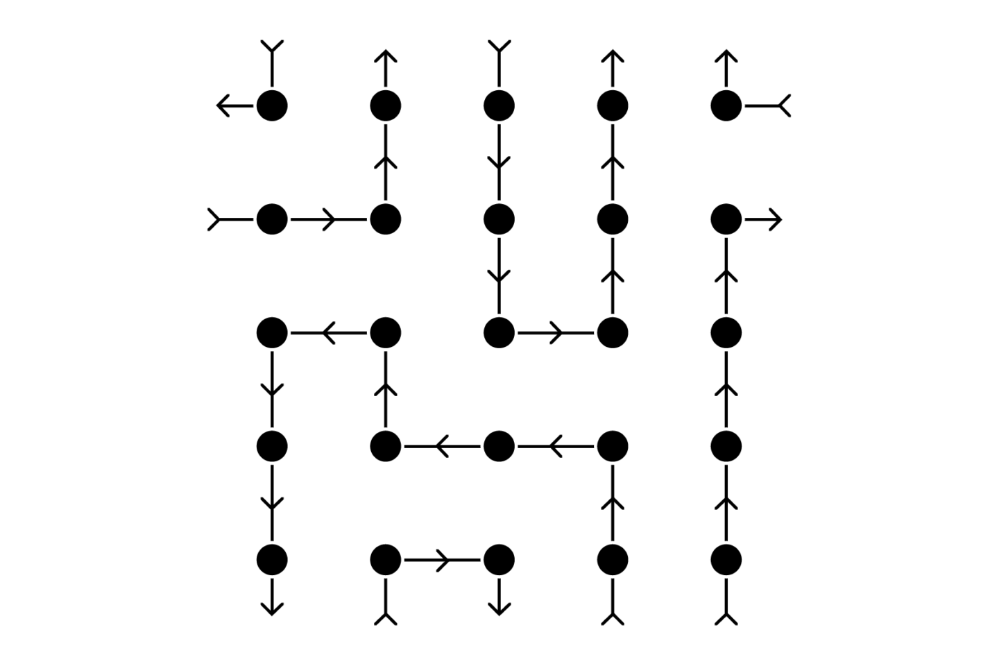 制作するなかで知ったのですが、これはハミルトン閉路問題にも似ています。ざっくりいうと、このような線と点からなる「グラフのすべての頂点を一度ずつ通って最初の場所へと巡る方法はあるか?」という問題だそうですが、今回の例だと何人かで手分けして巡っても構わないという少し条件の緩いバージョンになるのでしょうか。現に、この方法を考えるのにハミルトン路をランダムに生成するアルゴリズムを参考にしていたりします。