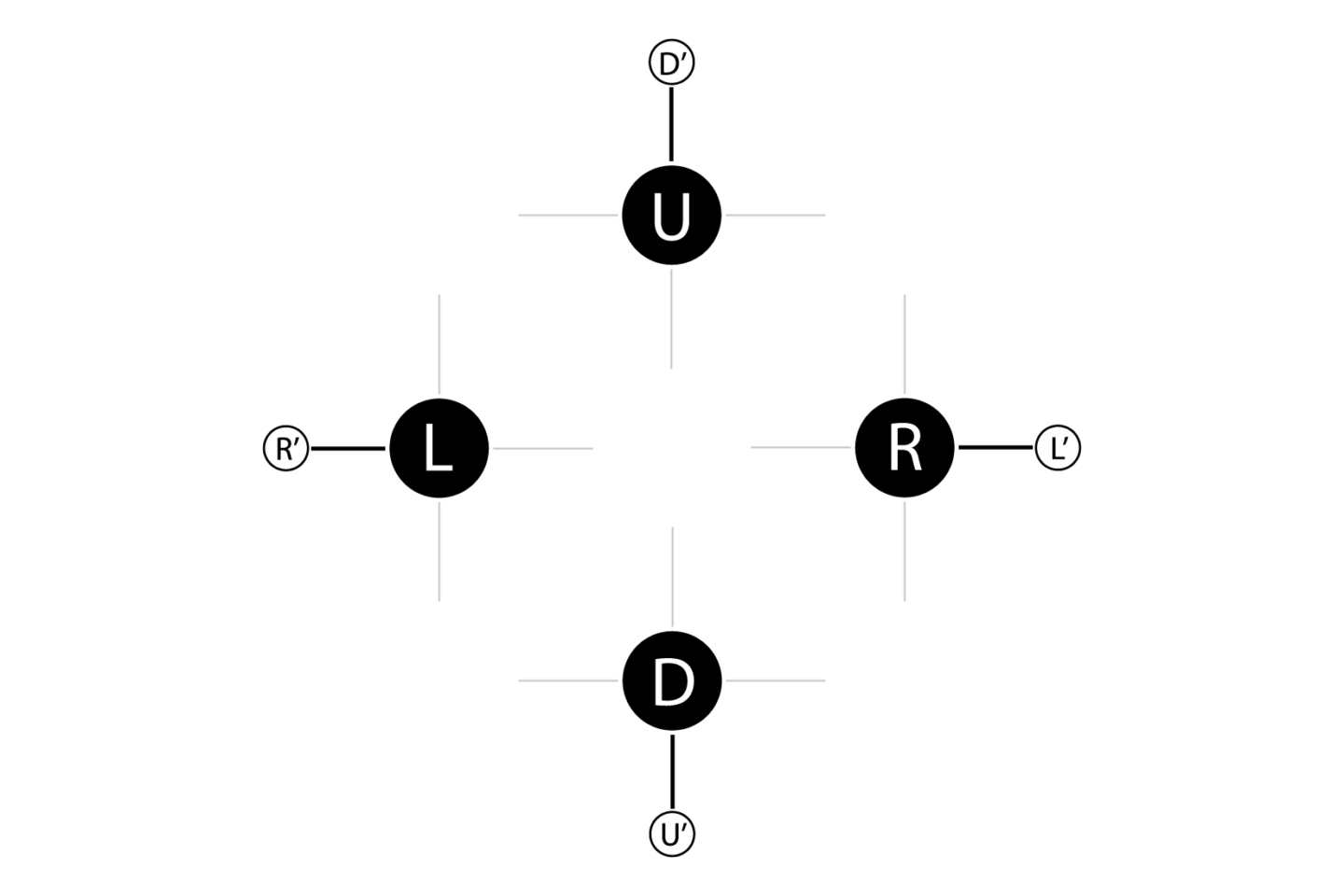 例えば、上からやって来て右へとはけていくのは U-R' と表せます。このように、あるマスは「もちがいずれかの方向からやって来るところ」という 4 状態から、「いずれかの方向へと去っていくところ」という 4 状態への変化を繰り返しています。こんな仕組みを賢く書き表せるのがステートマシン図(状態遷移図)です。