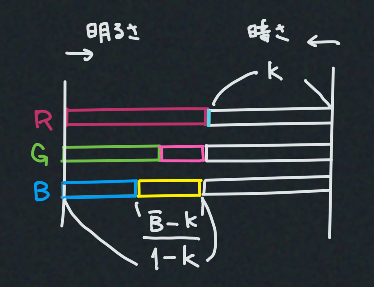 つまり、黒からのプラス分ではなく、白からのマイナス分としてRGB各チャンネルを捉える。
