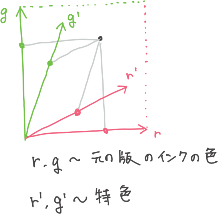 「オレンジ」「黄緑」に分版するには、あるピクセルの色を、特色それ自体のRGB値を基底とした座標系における座標値に変換すればいい。