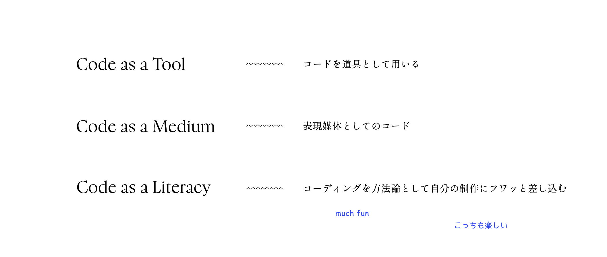 もう少しデジタルアート界隈に向けたことを書くとすると、Joshua DavisのいうPuristsやMax Benseの生成美学のように、ジェネラティブであることに純粋主義的であったり、理論的基盤を見出すのは豊かだと思う。そうした地固めはジェネラティブアートがこれから現代美術として受け入れられていく上では必要なことだとも理解している。久保田先生も仰るとおり、美術における「生成」はまだまだ掘られきっていないテーマなのだから。その上で思うのが、工芸でも美術でもない、第三の道っていうのがクリエイティブ・コーディングにはあるんじゃないかってこと。そういえば、2年前BNNから『Code as a Creative Medium』なんて本が発刊されたっけ。曰く、コーディングは道具であると同時に表現媒体でもある。けどそれと同じくらい、世界を新しい読みかたで理解し、そして書き換えていく、いわばリテラシーとしてのコーディングも大事なんじゃないかってのがぼくの考え。