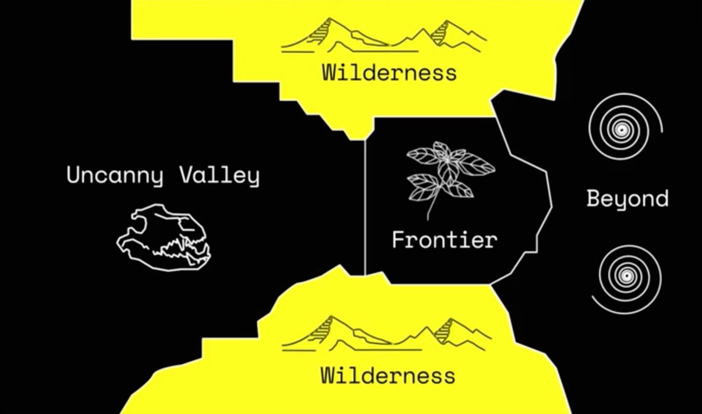 Alan Warburton がビデオエッセイ『Goodbye Uncanny Valley』にて言及した概念。不気味の谷を克服し、リアリズムの山の頂上を一直線に踏破するだけではなく、そこから逸脱した先にも表現の萌芽が散りばめられた広大な荒野が存在するという視点。