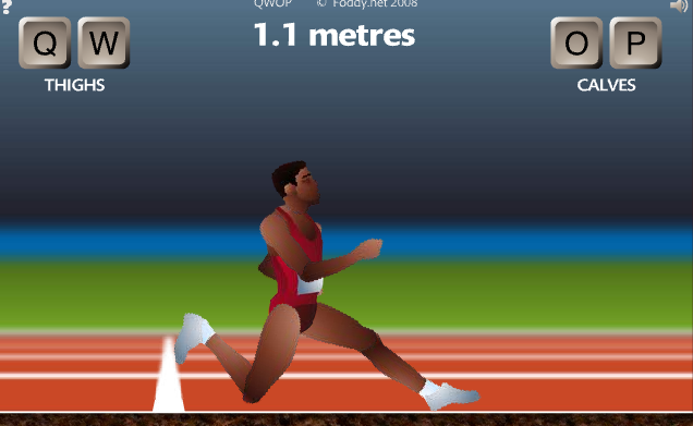 ゲーム『QWOP』は、その操作のしづらさを楽しむクソゲーで、その名の通りQWOPの4つのキーのみを操作に用いる。QとWが股関節の開閉、OPが膝関節の角度の調整に対応している。これは、人が走る時に意識するであろう「左右の脚ごとにどのくらいの強度で地面を蹴り出すか」というパラメーターから乖離している。キーの押下した間だけ一定速度で関節が動くという仕様もまた、操作のしづらさに拍車をかけている(操作の次元)。