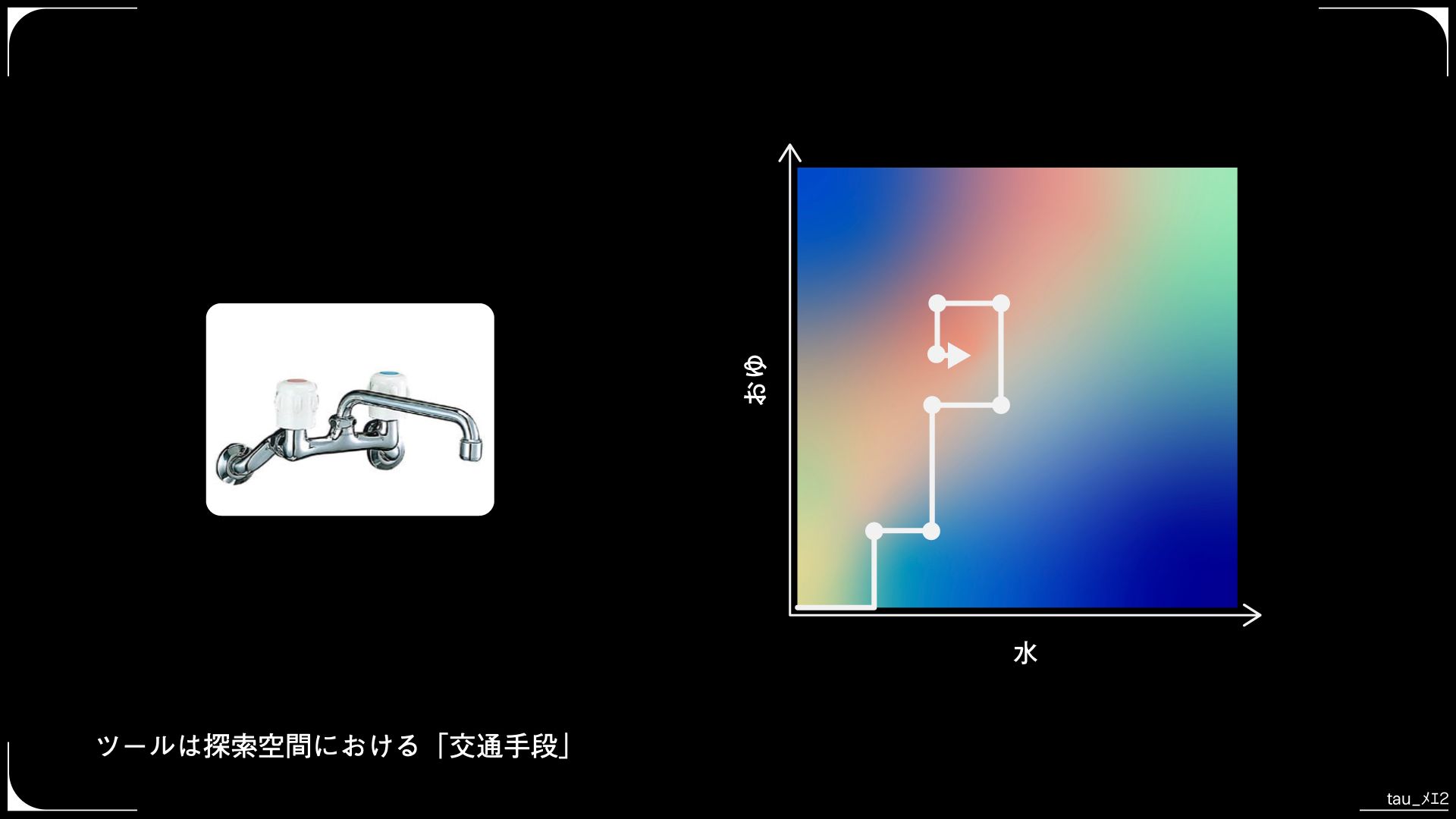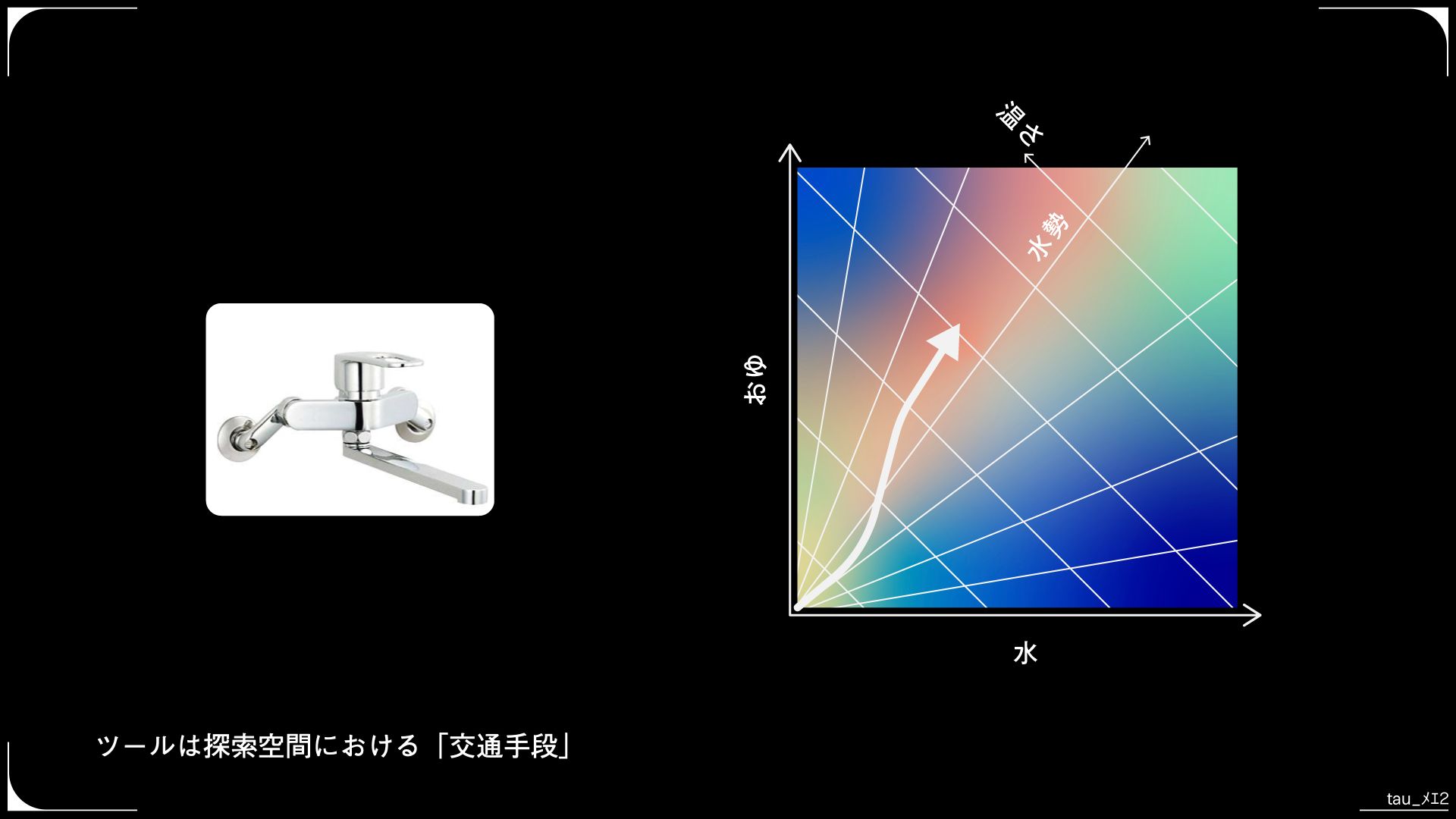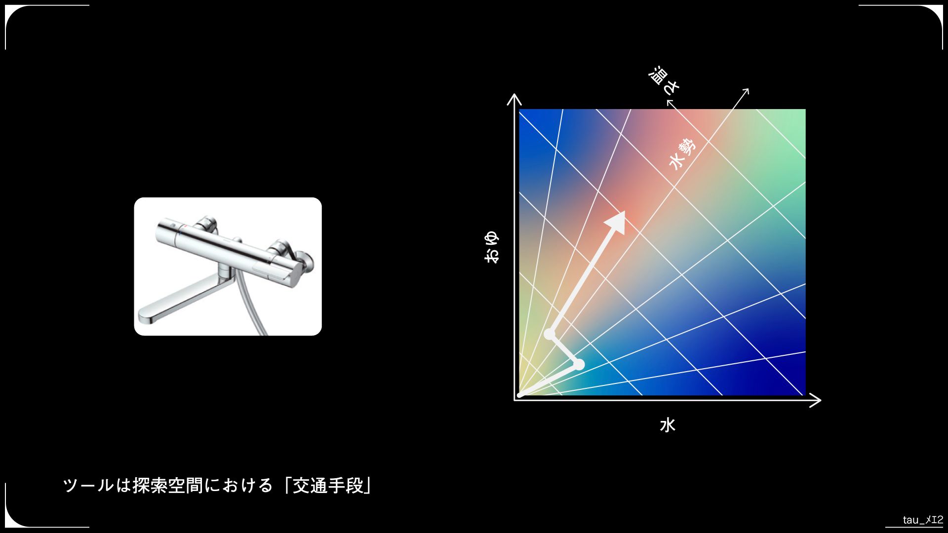 そこで、回転方向が水と湯の混合比率、縦方向が水量のレバーを持つ混合水栓が発明されました。レバー型混合水栓は、 (冷水の量, お湯の量) からなる直交座標系を、より認知的に自然な (水勢, 暖かさ) という2つのパラメーターから座標空間に変換する装置といえます。