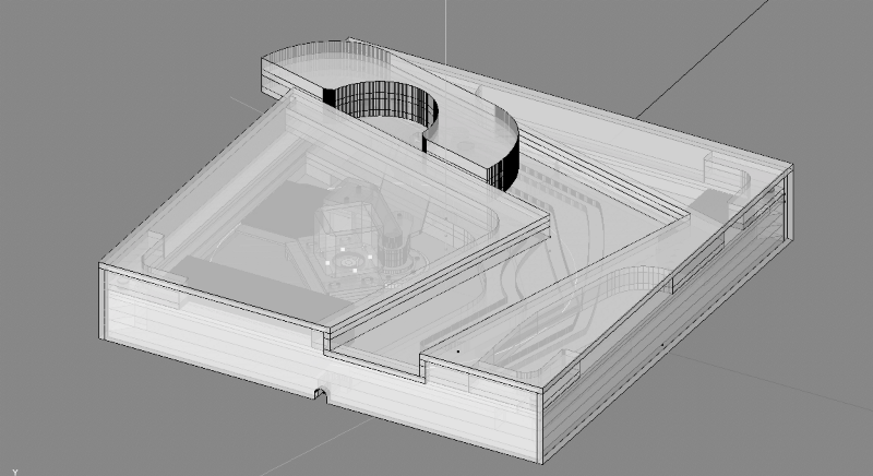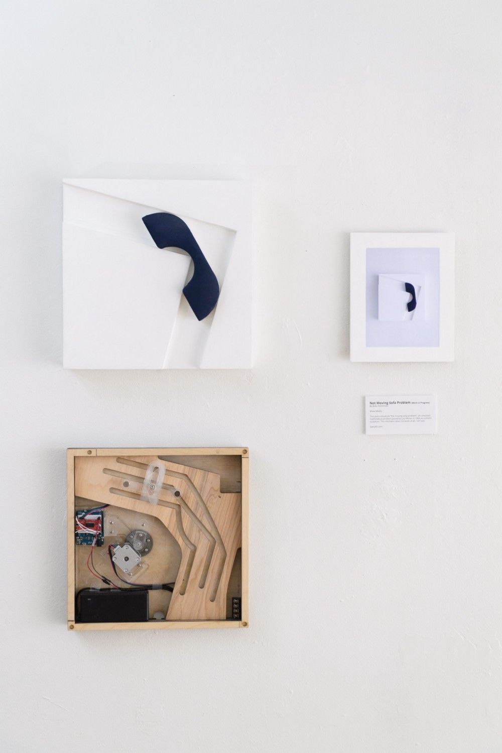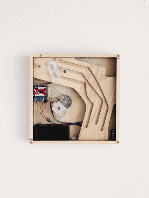 This piece visualizes “the moving sofa problem” as a kinetic sculpture. The “sofa” moves through the L-shaped corridor forward and backward repeatedly.