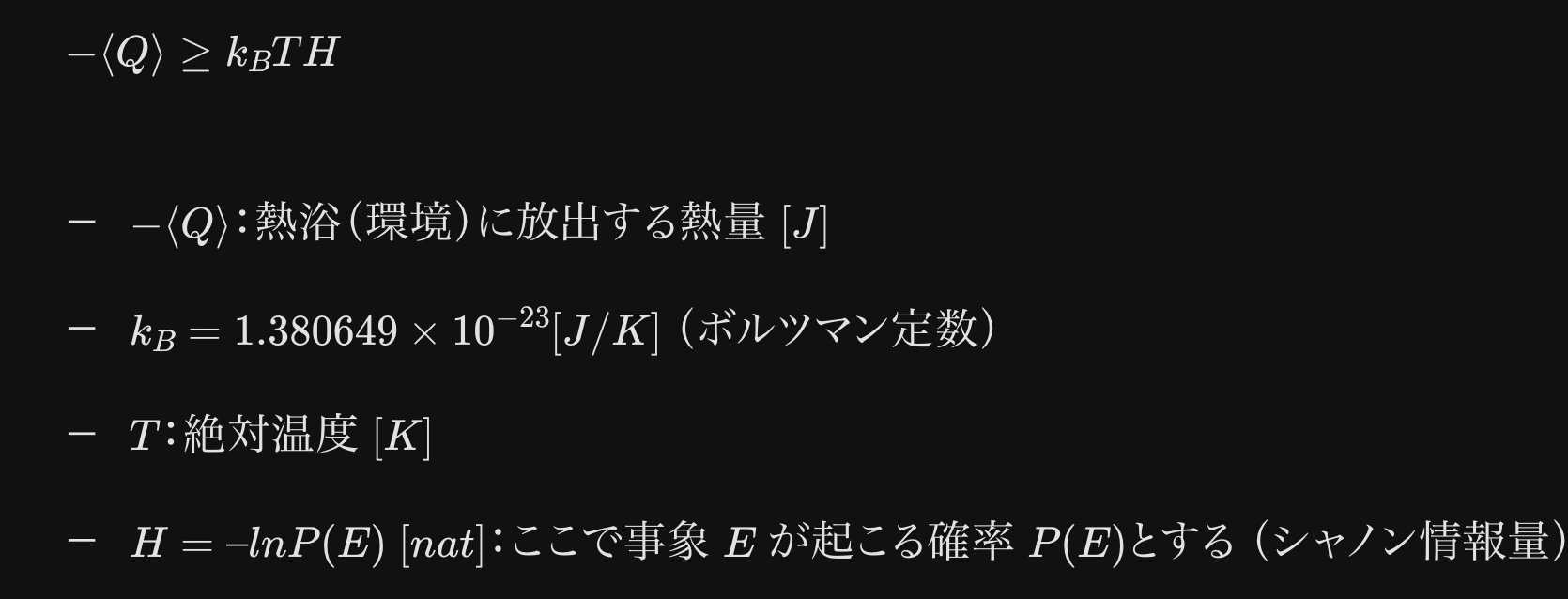 この式の意味は「シャノン情報量を《消去》すると、少なくともの熱が環境に放出される」ということである。つまり情報は作り出す時ではなく、例えばメモリークリアのように、それを《消去する》ときに熱を放出する。もちろん、この熱は実質的には極めて小さい。