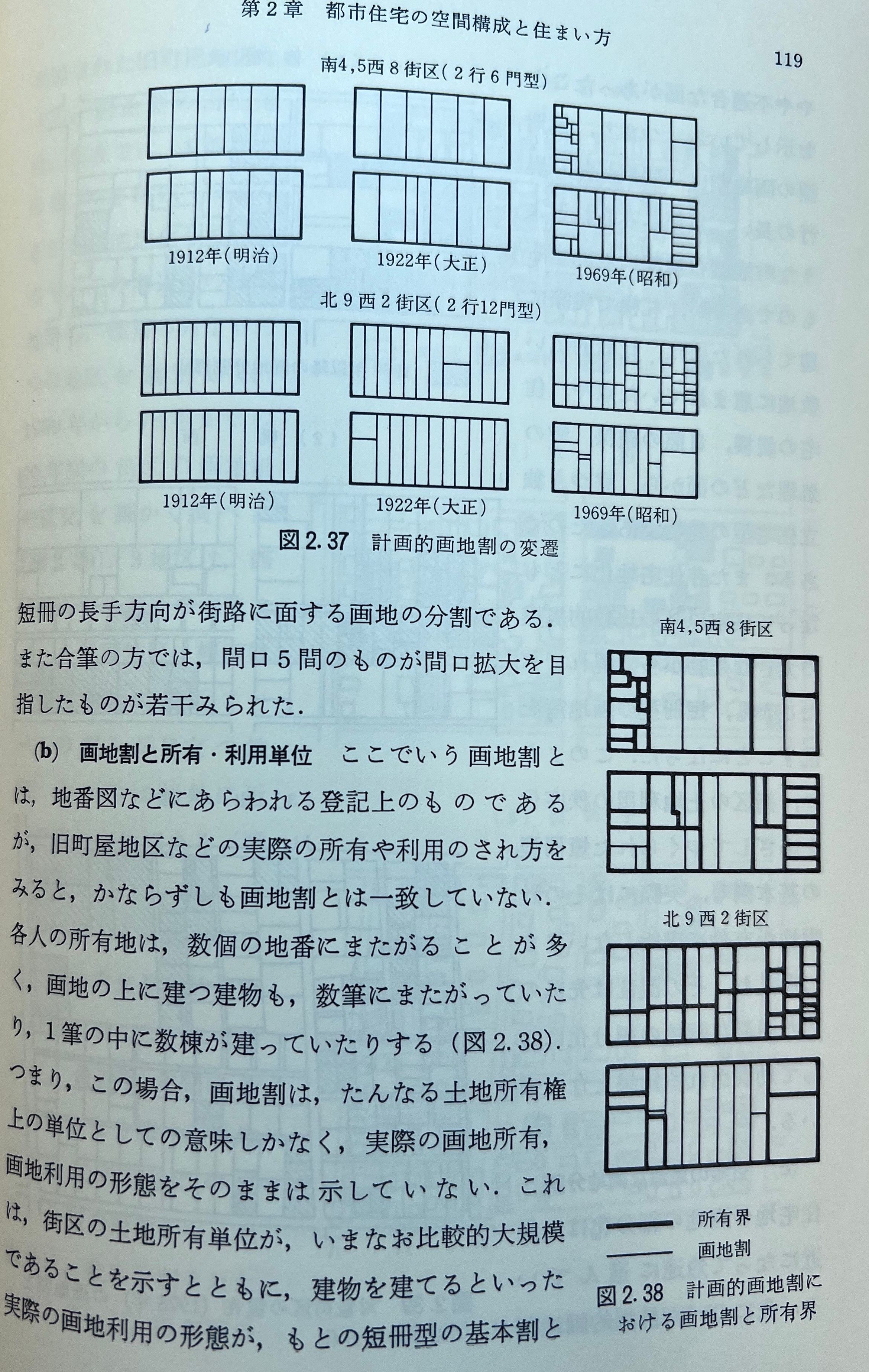 札幌の街区は比較歴史が浅い。庭付きの独立住宅を中心とした低密度な厚生から、画地の細分化、建混み、狭小住宅地の発生、木造賃貸アパートの急増など、変容を見せる。街区も混乱、不良化。