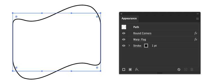 There is a rectangular path with filters such as Round Corners and Warp: Flag stacked beneath it. The pseudocode I wrote earlier for p5.path is similar to this mechanism. Artists simply need to describe “a warped rectangle with round corners” without having to worry about each coordinate or the control points of Bézier curves after these filters are applied. The design principle of p5.path that I mentioned earlier, “declarative, immutable, and functional-programming oriented” might sound overly technical and appealing only to code snobs. However, the system I propose offers an intuitive paradigm of graphic programming, especially for those used to graphic software, and even provides accesibility to those not accustomed to algorithmic thinking.