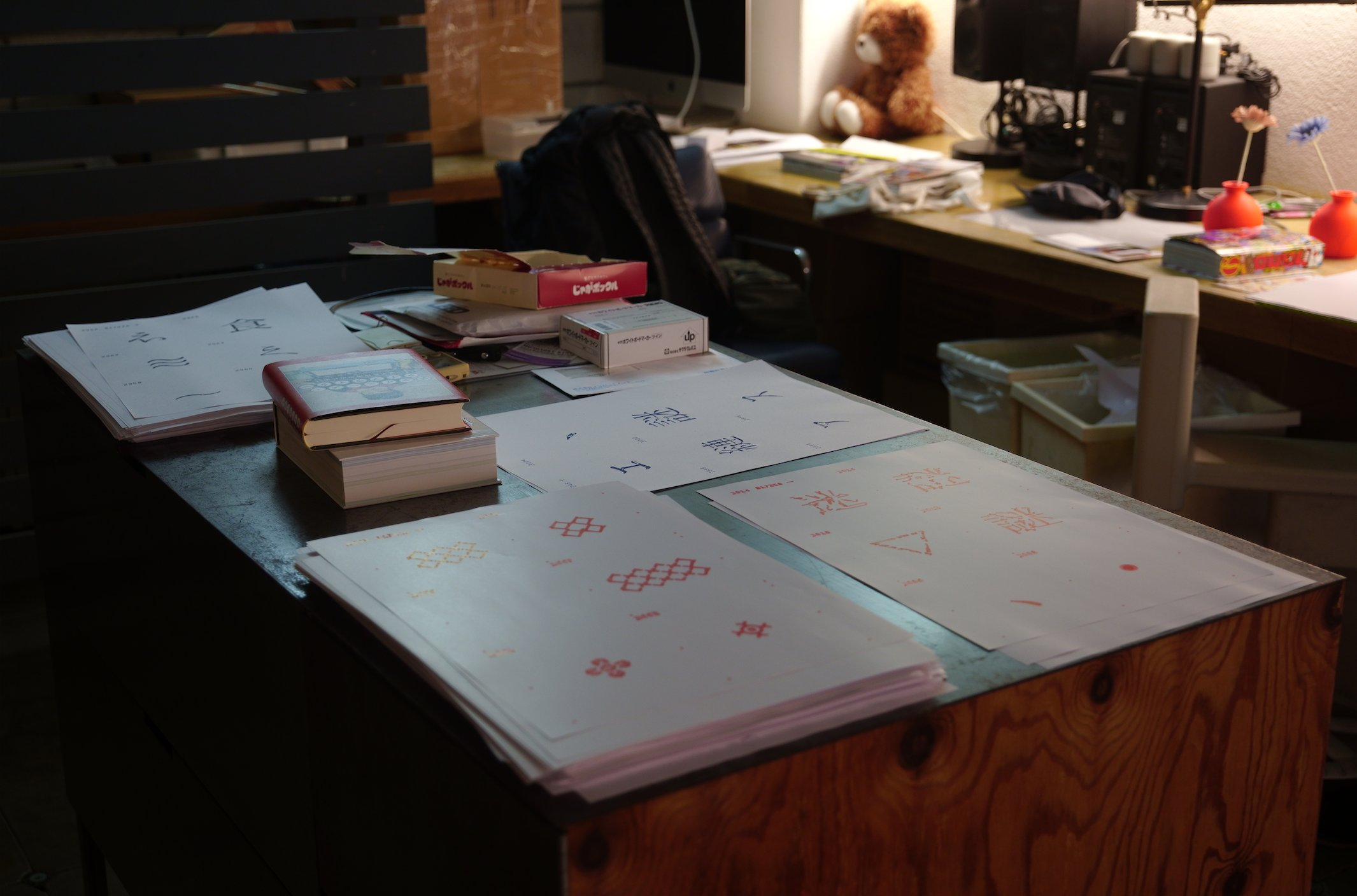 • そ一枚の紙に重ね描きするとき「A: どう修正液で消し込み」「B: どうその上からペンで加筆するか」という2つの筆跡を、2台のペンプロッターを並列で動かしながら出力し、更にその上から麦の手で加筆をした