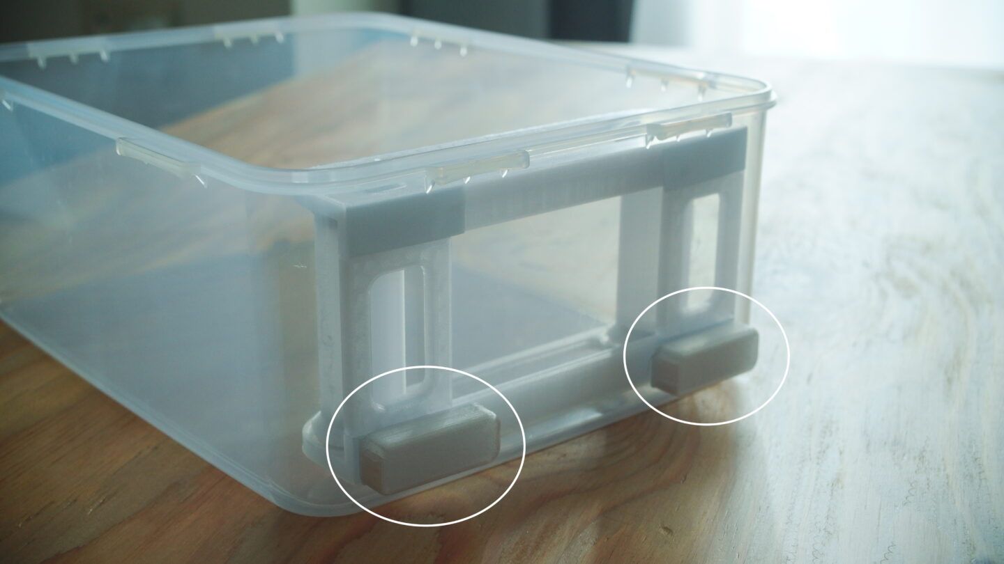 leg, Single_Filament_Spool_Holder は、2 つずつプリント。密閉容器と雰囲気をあわせるために Overture PETG Trapsarent を使いました。どのみち透け感は無くなるのですが、infill は honeycomb 15%だと良いテクスチャになりました。ベアリングをくっつけて雰囲気で組み立てます。あとはホルダーと脚を厚手の両面テープでくっつけます。密閉容器の側面は湾曲しているので、ホルダー下部は四隅のみ接着しました。