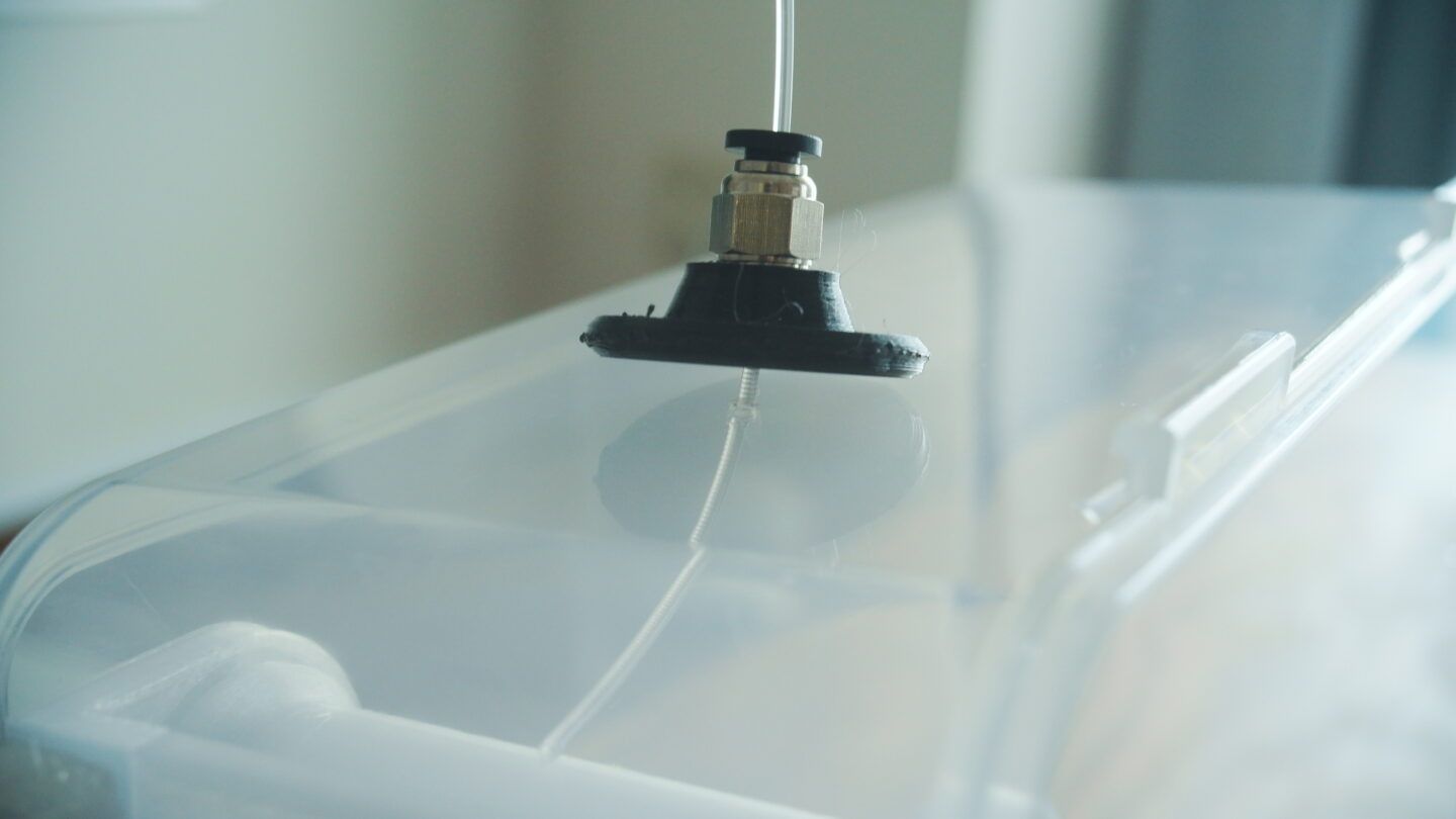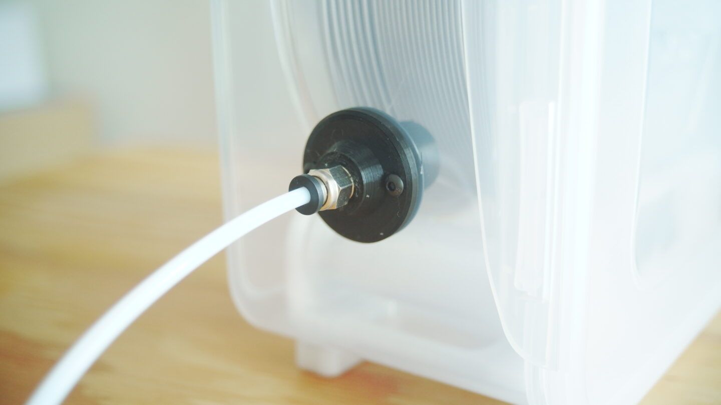ちなみに参考元の記事では継ぎ手を容器上部に付けていたのですが、エクストルーダーまでの距離を短くするために僕のバージョンでは容器下部につけています。フィラメントの巻きクセ方向とは逆方向に曲げられることになるので、あまりおすすめはしません。個人的にはスッキリして見えて好きなのですが。