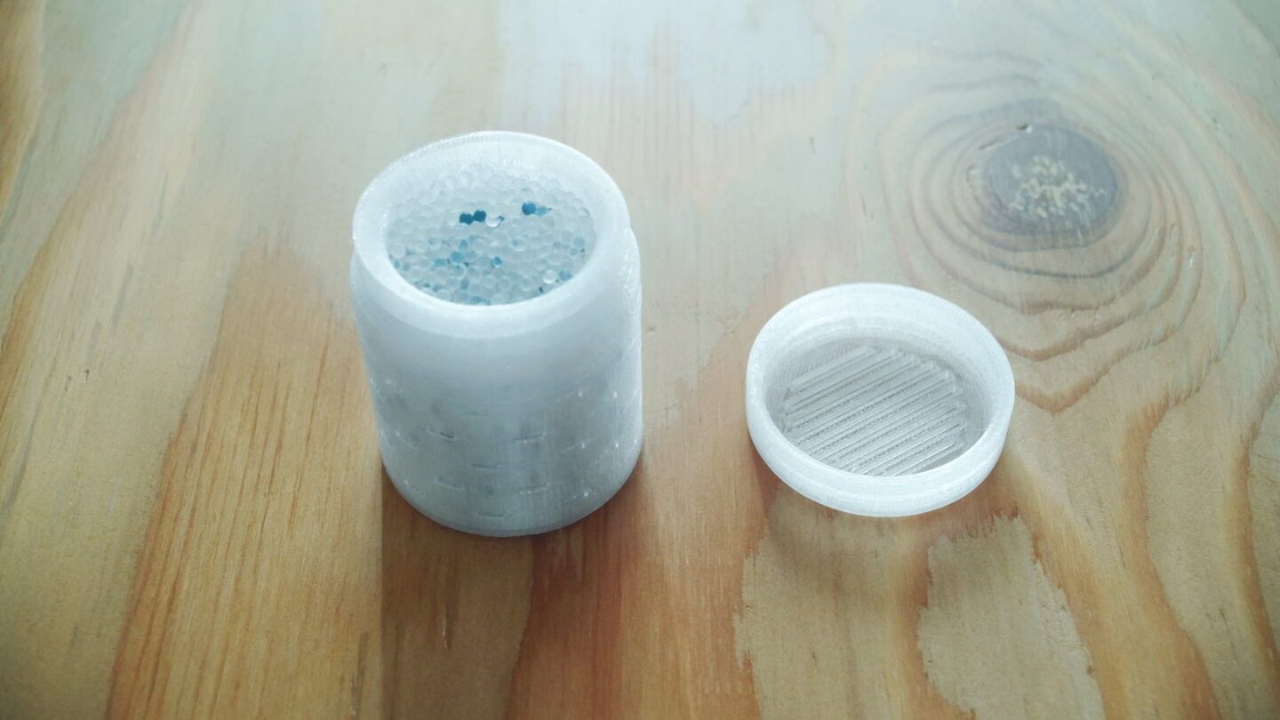 シリカゲル用キャニスターも出力しました。これも PETG Transparent。つぶつぶの色が見えやすい。