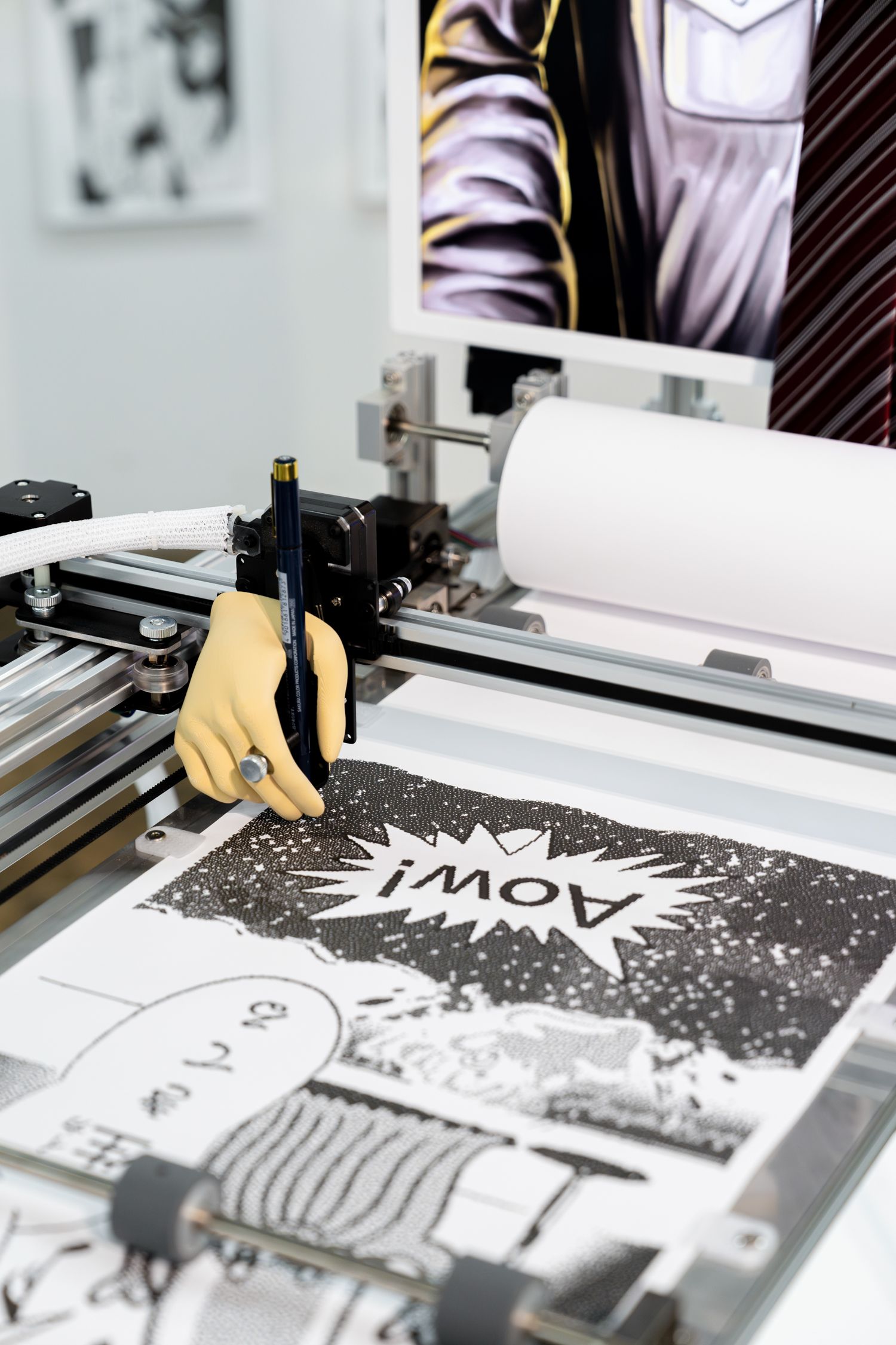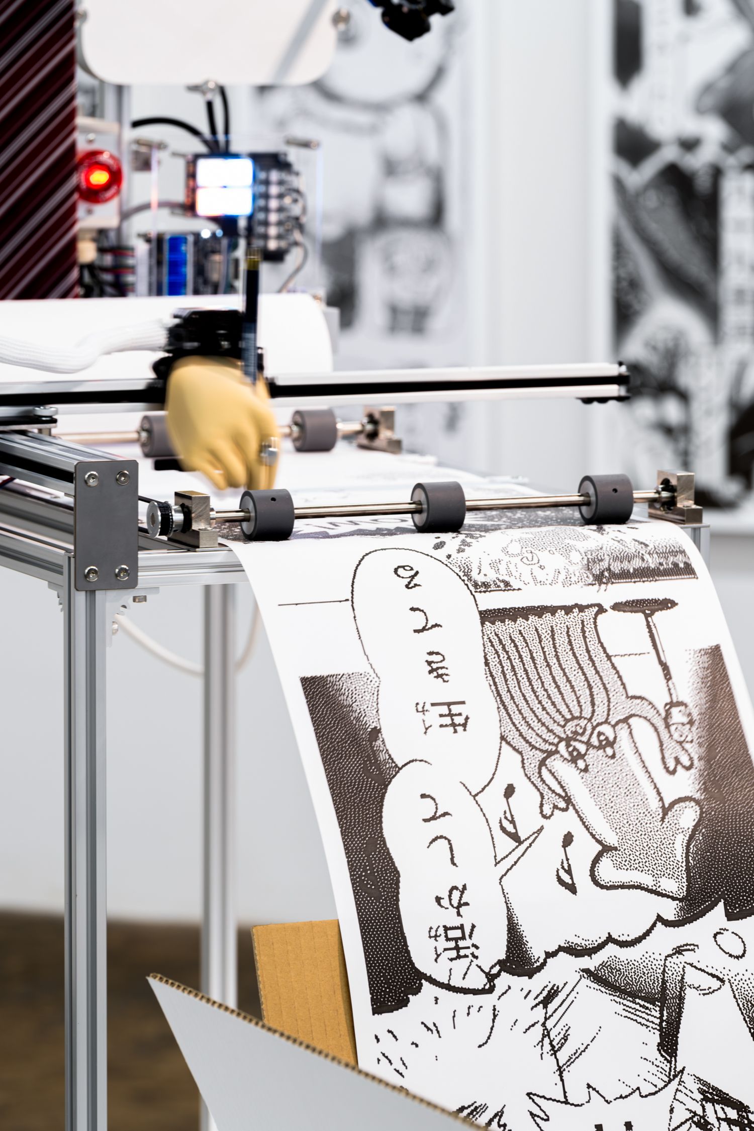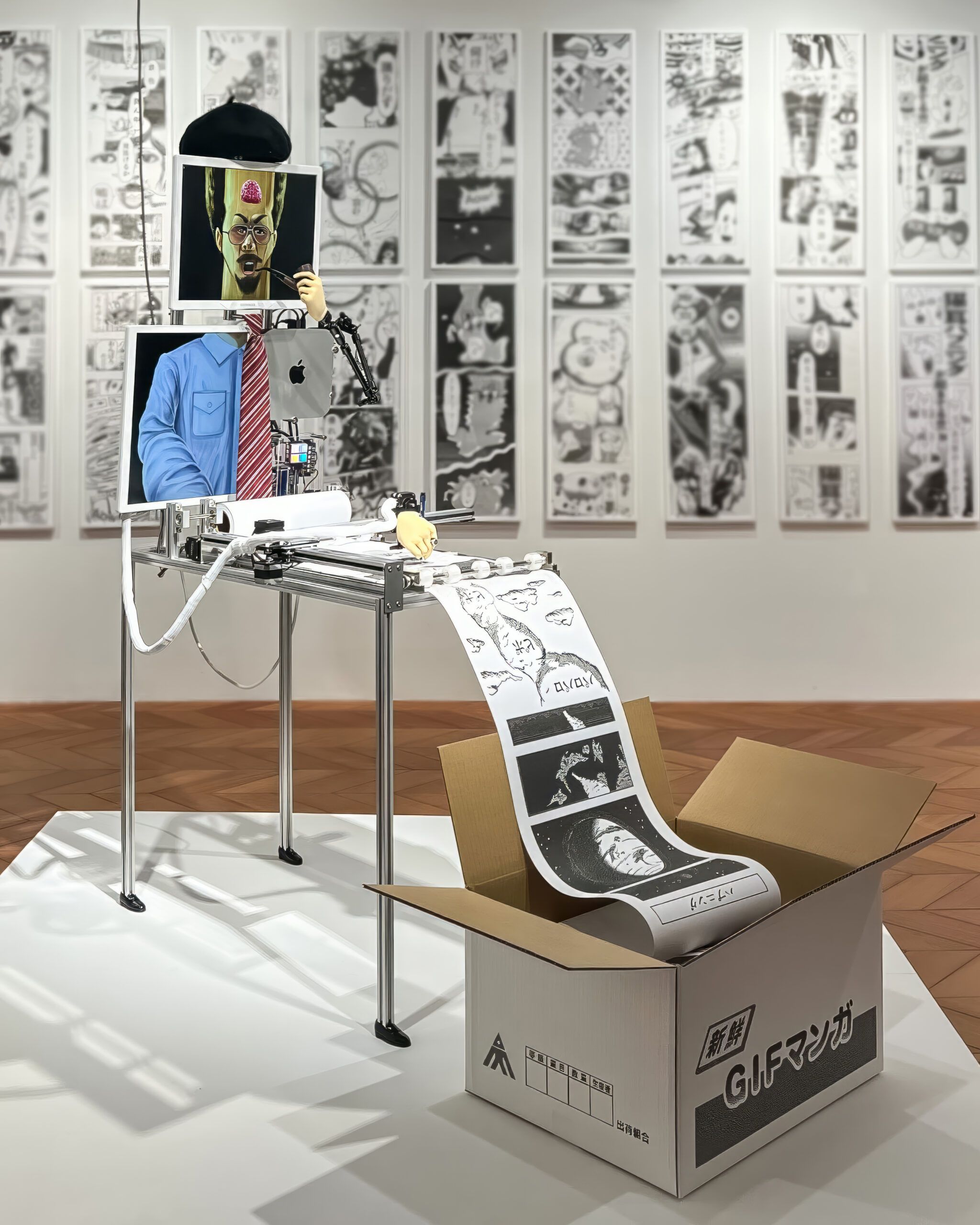 AC部個展「GIFTOOOON』にて展示された、自動でGIF漫画を生成するマシン「自動漫画家」をデザインから設計、プログラミングまで一人で担当。30メートル以上にわたる縦長の漫画を描き続け、会期中も新作を生成・出力し続ける仕組みを構築した。AC部がキャラクターデザインやコンセプトの肉付けを行っている。同時期にbaku89.iconが模索していたCNC(ペンプロッター)技術を用いた表現や、GIF漫画専用アプリ『Kindolphin」ともコンセプト的に接続し、紙とデジタルの両面からGIF漫画表現の可能性を探った。