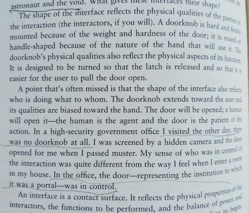 振り返ってみると、ノーマンの同僚や、同じ時代を行きていた人々は、ドアノブのメタファーにそこまで感心していたわけではなかったことが伺えます。ブレンダ・ローレルは『インターフェースとは何か』(What Is Interface)という短い導入文で22、ドアやドアノブというものが、実は複雑さや制御や権力、「誰が誰に何をしているのか」を強く示していると指摘しています。