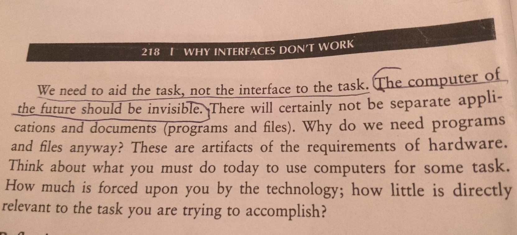 わたしたちはタスクを補助すべきであって、そのタスクへのインターフェースの補助をすべきではない。未来のコンピューターは見えなくなるべきだ。そこにはアプリケーションとドキュメントの区別すらないだろう(プログラムもファイルも)。そもそも、なぜプログラムやファイルが必要なのだろうか? そうしたものはハードウェアの制約が生んだ人工物にすぎない。いまコンピューターで何かをしようとするとき、どれほど多くのことが技術によって強いられ、どれほど少ししか、実際のタスクに直接関係していないかを考えてみてほしい。