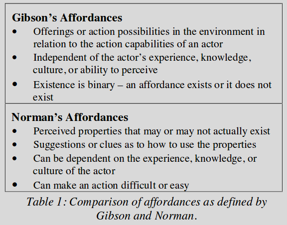 対象の知覚された性質、あるいはむしろ、その対象がどのように使えるかを特定する情報まで含めるノーマンとは異なり、ギブソン的なアフォーダンスは、それを知覚する行為者の能力から独立している。26