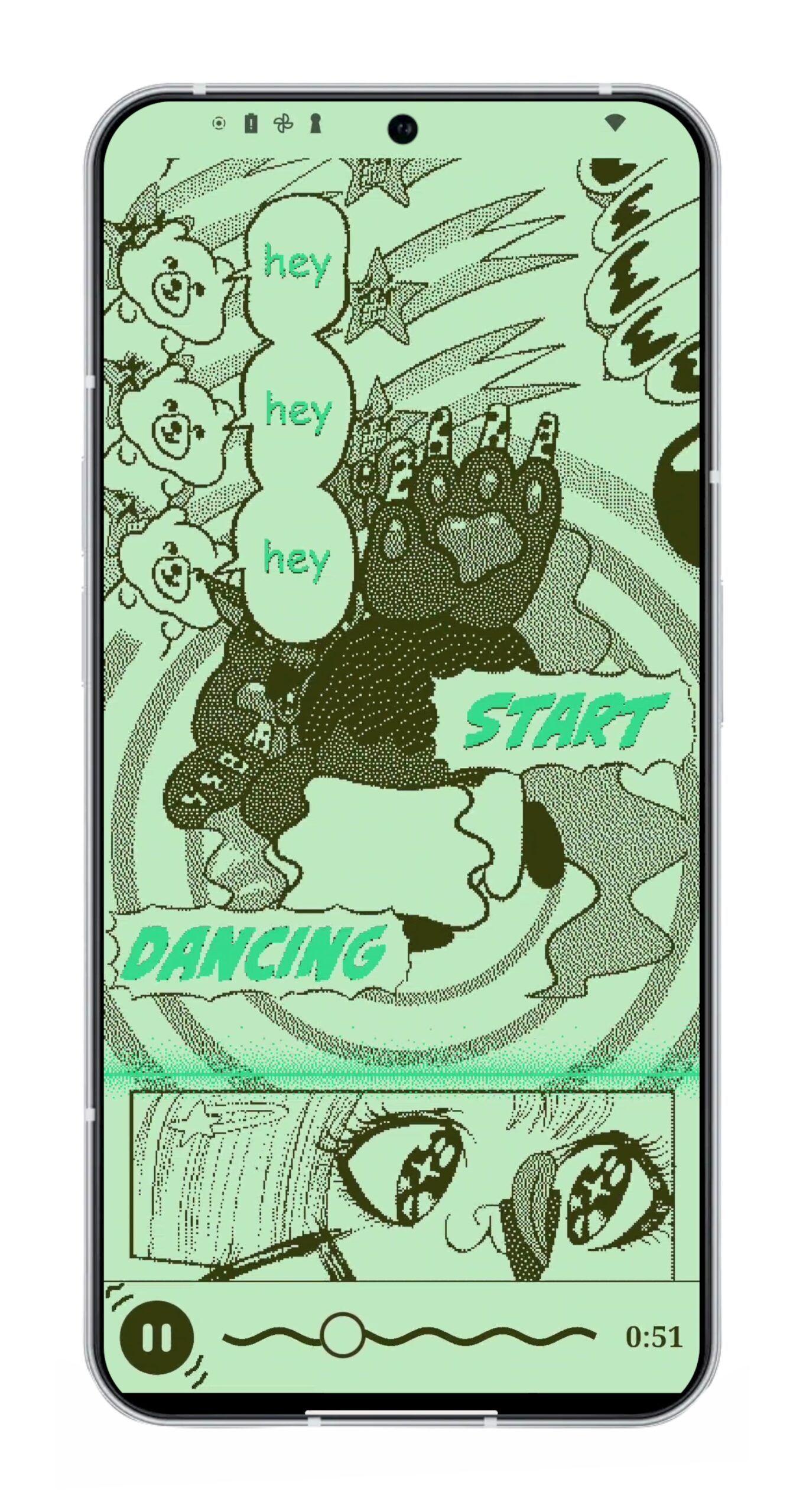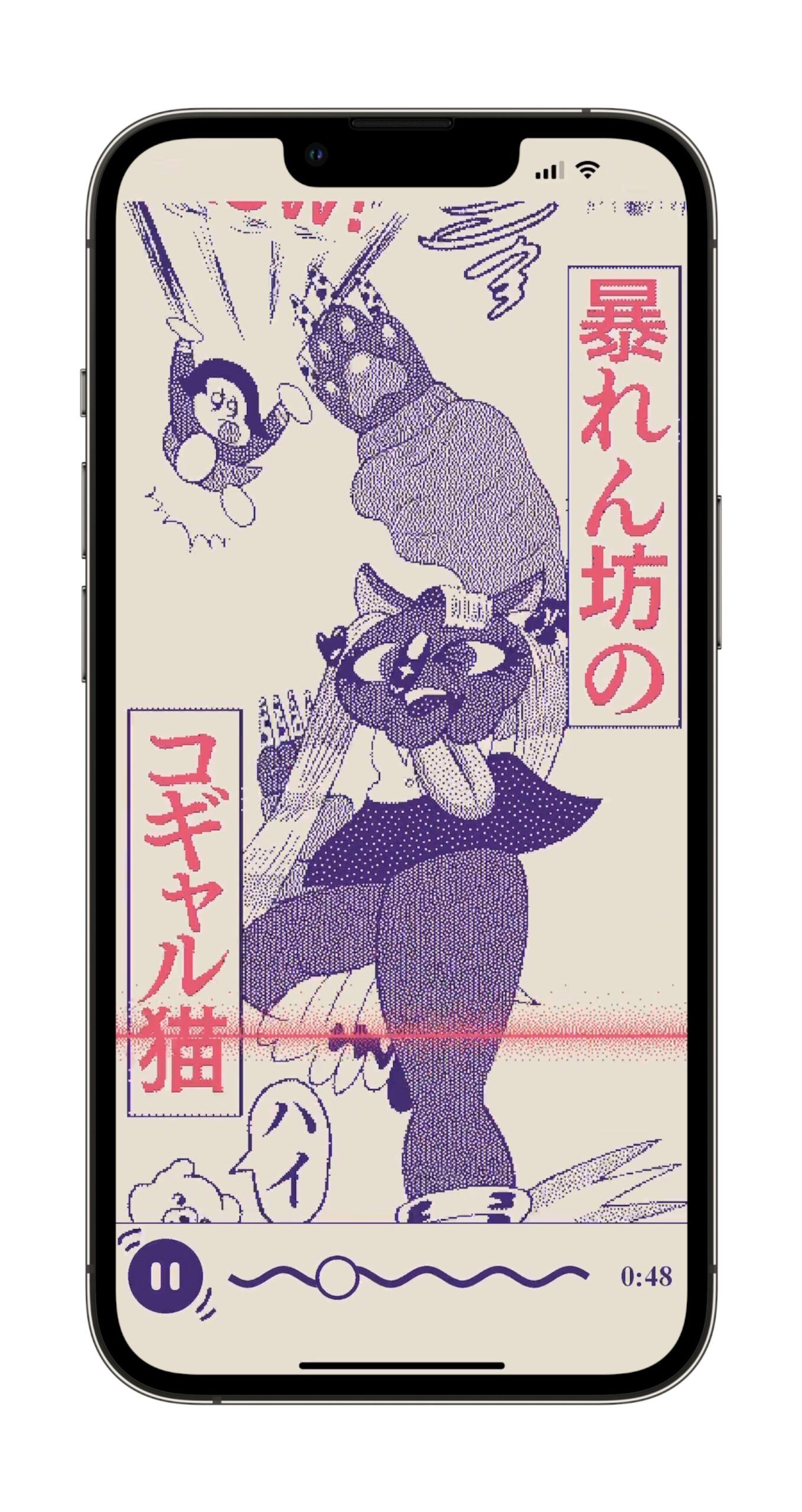 To celebrate the release of group_inou’s first single in ten years, “HAPPENING,” we collaborated with AC-bu to create an interactive music video app. By combining the vwebtoon style of webtoons with GIF animations and lyric video techniques, the lyrics of the song are faithfully transformed into a comic. UUsers can freely scroll or scratch through the work, enjoying it non-linearly while experiencing the sharp, lossless texture unique to GIFs.