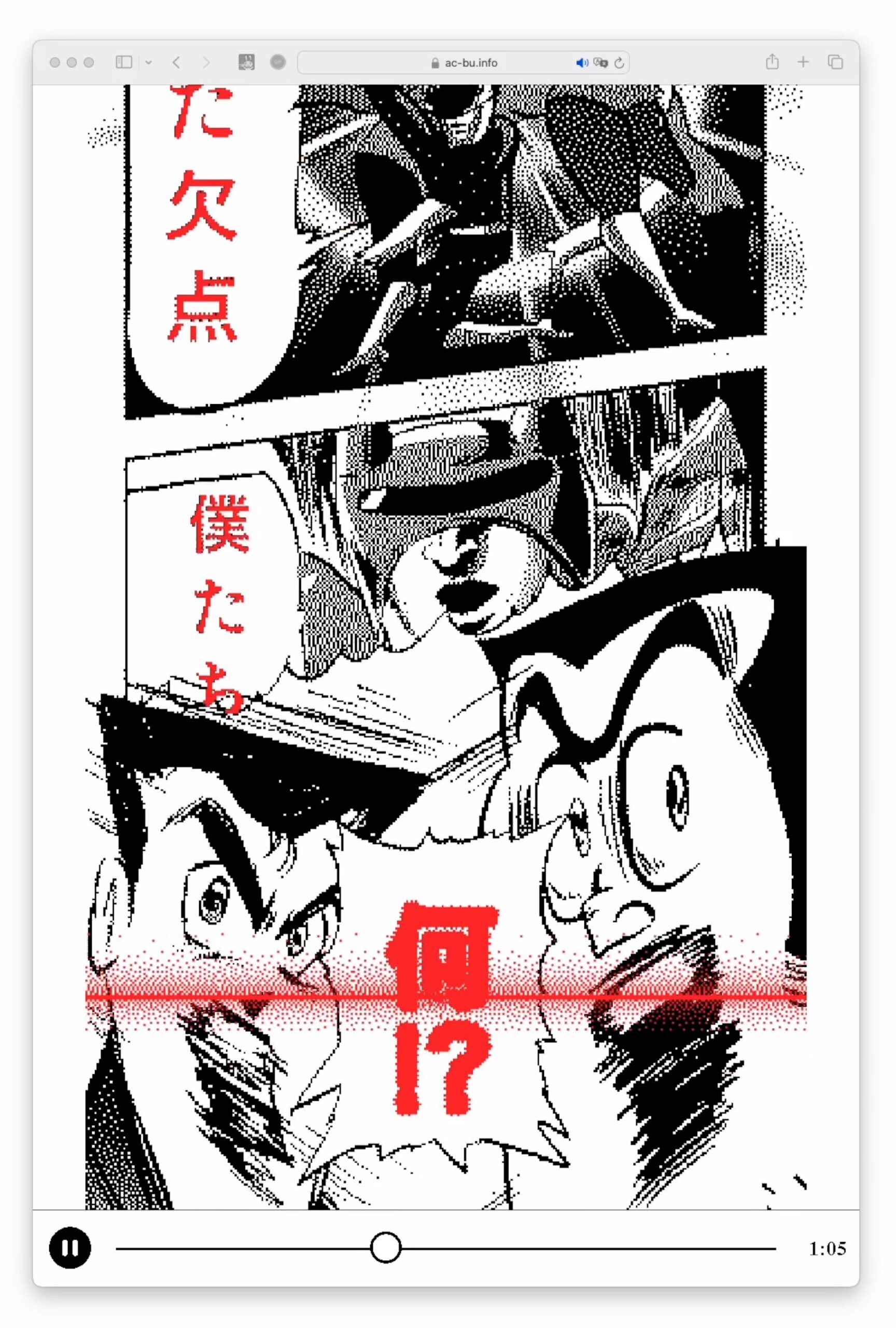 The app also includes the complete collection of AC-bu’s past “GIF comics.” It is built as a Progressive Web App, distributed without relying on proprietary platforms, and functions as a Kindle-like e-reader dedicated to AC-bu’s expression. The project will continue to be updated over the long term.