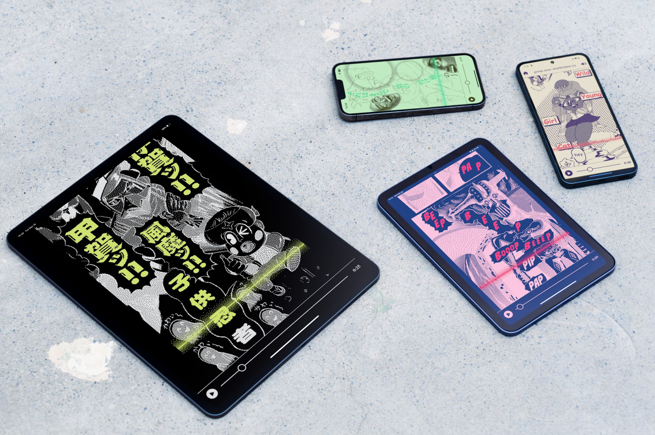 group_inou / HAPPENING Kindolphin group_inouとAC部のミュージックビデオ作品『 HAPPENING 』をWebアプリ化しました。デザインと実装はぼく一人です。元のビデオがGIFアニメ縦長漫画が歌詞に合わせて自動スクロールする仕様だったので、GIFの質感を