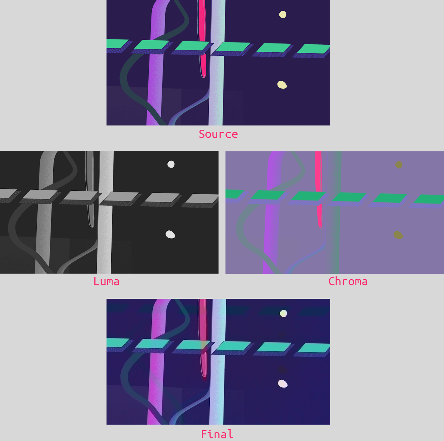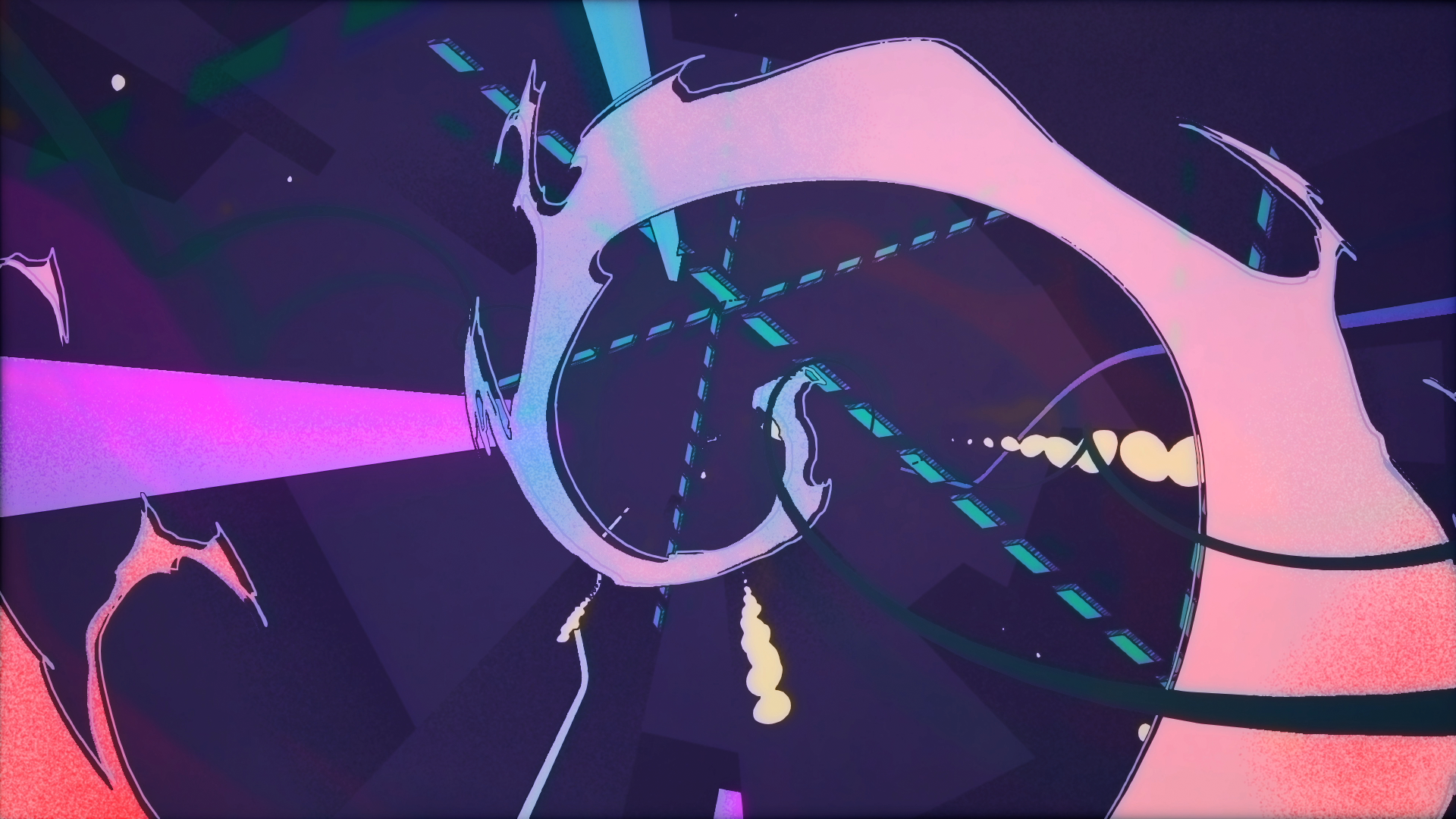 色相のみカメラでディスプレイを再撮影することで、昔の地上波のような変なディティールを作る事ができました。また、輝度情報は元データのままなので、解像感も損ねません。ちなみに今回配色やグラフィック素材に関しては僕に殆ど一任していただけたので、「デジタルともアナログともつかない、抽象度の高いローファイ感」というのをルックの指針として設定しています。