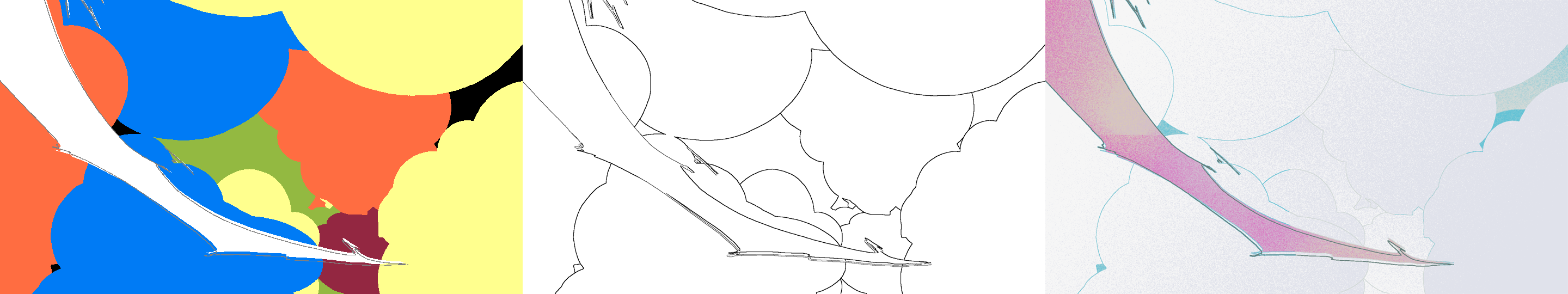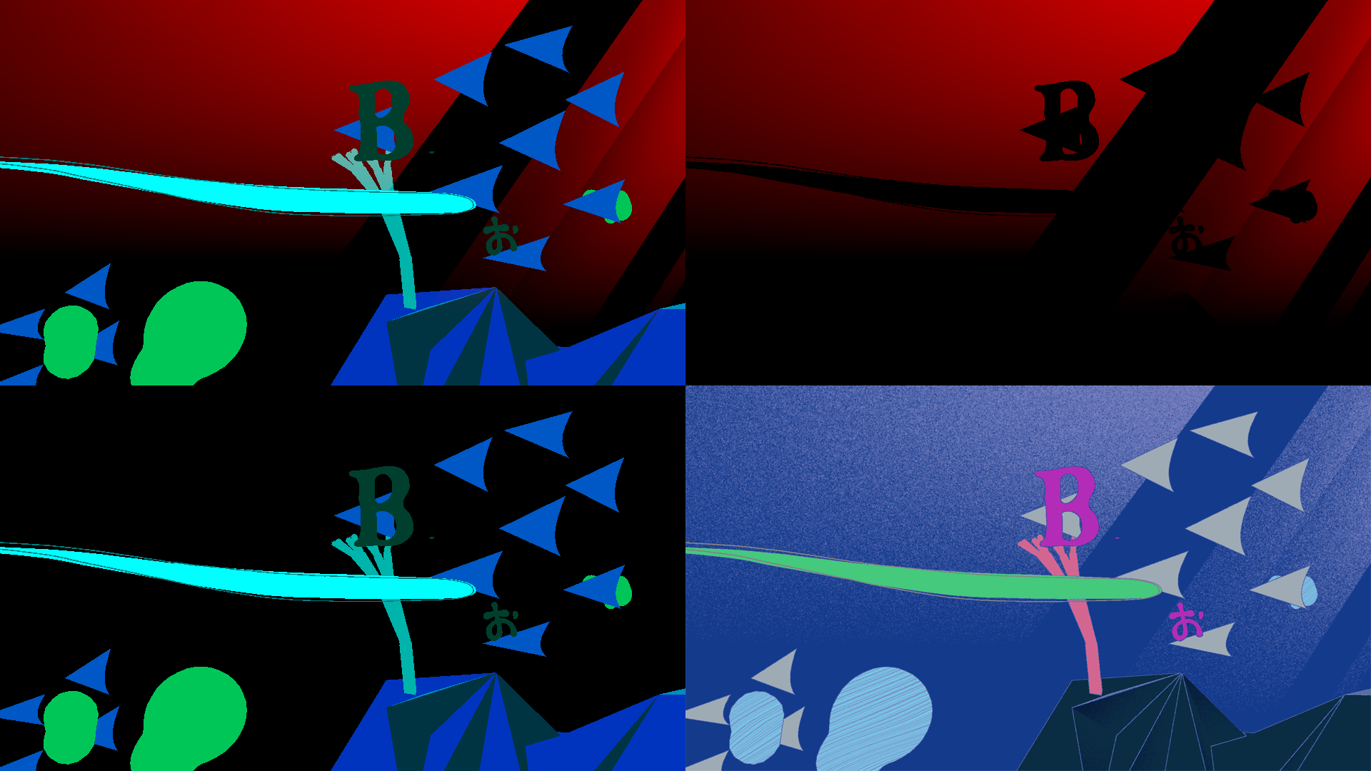 ちなみに ディザ合成 は不透明度の変わらない部分のディザパターンはフレームを跨いでも固定されているのに対し、 ダイナミックディザ は毎フレームパターンが変わっていきます。今回は全て ディザ合成 に統一しています。冒頭カットの周辺部や雲の陰影を見るとパターンが静止して見えるのが分かるかと思います。