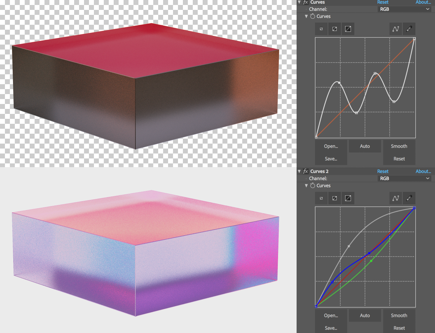 せっかくなので、フォトリアル以外のなにか面白いルックを探ってみることにしました。すりガラスのような質感の元素材に、ぐにゃぐにゃのトーンカーブをかけて偶発的に色味が馴染んだところを狙って使っています。