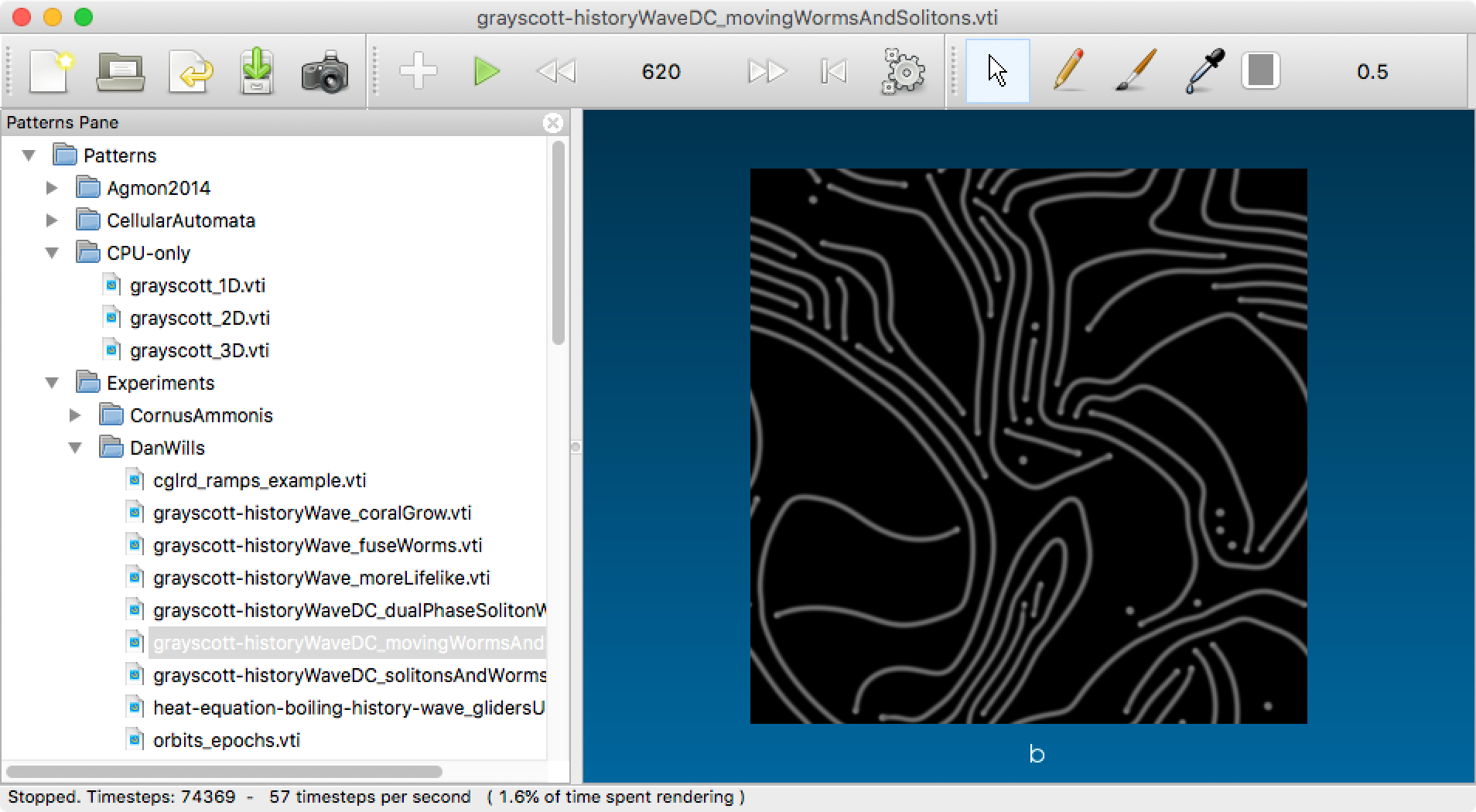 プリセットにはチューリングの論文出典のサンプルや、おなじみ Gray-Scott もあります。個人的には Experiments カテゴリが何かと良い感じです。ビジュアル・アーティストのCornus Ammonisのコードもありますが、今回は Dan Wills 氏のものを多く使わせて頂きました。