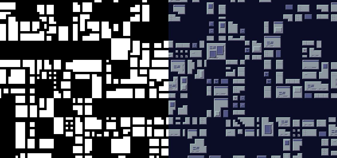 途中のウィンドウ群の摩天楼らしきものの構造の生成につかいました。とはいえ、ここで生成されたパターンを元に、Photoshop で輪郭をクリーンアップした上で **UI 化(後述)**を適用したり、手作業で UI を配置するなどしているので、一から十までジェネラティブな手法とは言えません。