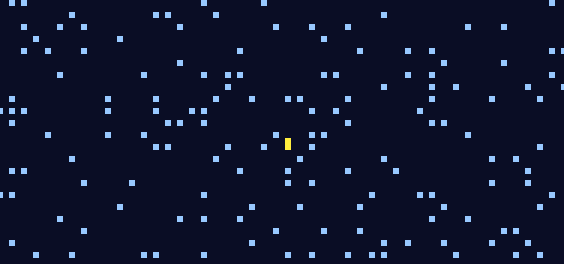 An original rule used in the birth of objects. Leaving similar pattern as "Conway's Game of Life," it spreads less chaotically and simply to increase their areas so they can be seen in many parts of the movie. New rules of life span and maximum birth number are also added to make it more useful as a transition effect. Both active cells stay over their life spans or go though birth-death-cycle more than maximum number of birth are automatically killed and turn out to be nonactive objects changing their colors to text or UI of commands.