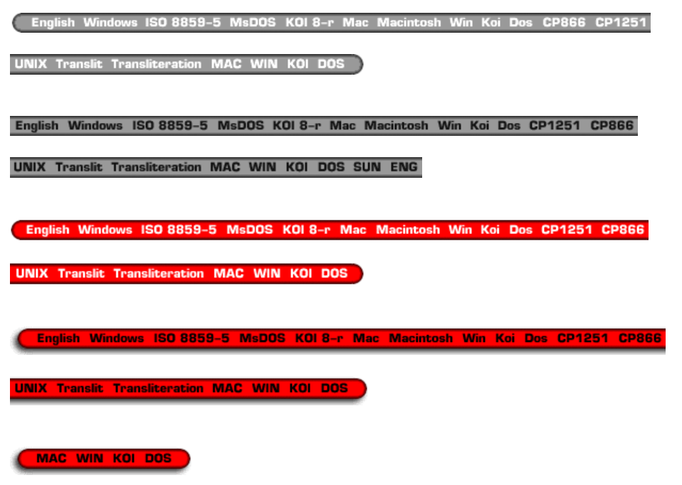 ロシア語圏のインターネットユーザー、正確にはキリル文字を使う書き手たちにとって大きな問題だったのが、膨大な文字コードの種類だった1。ロシアのサイトのトップページでは、適切な文字コードを選ぶ必要があった。これらの文字コード選択ボタンはデザイナーにとって格好の実験場で、多くの人が独自のカスタマイズを施して楽しんでいた。