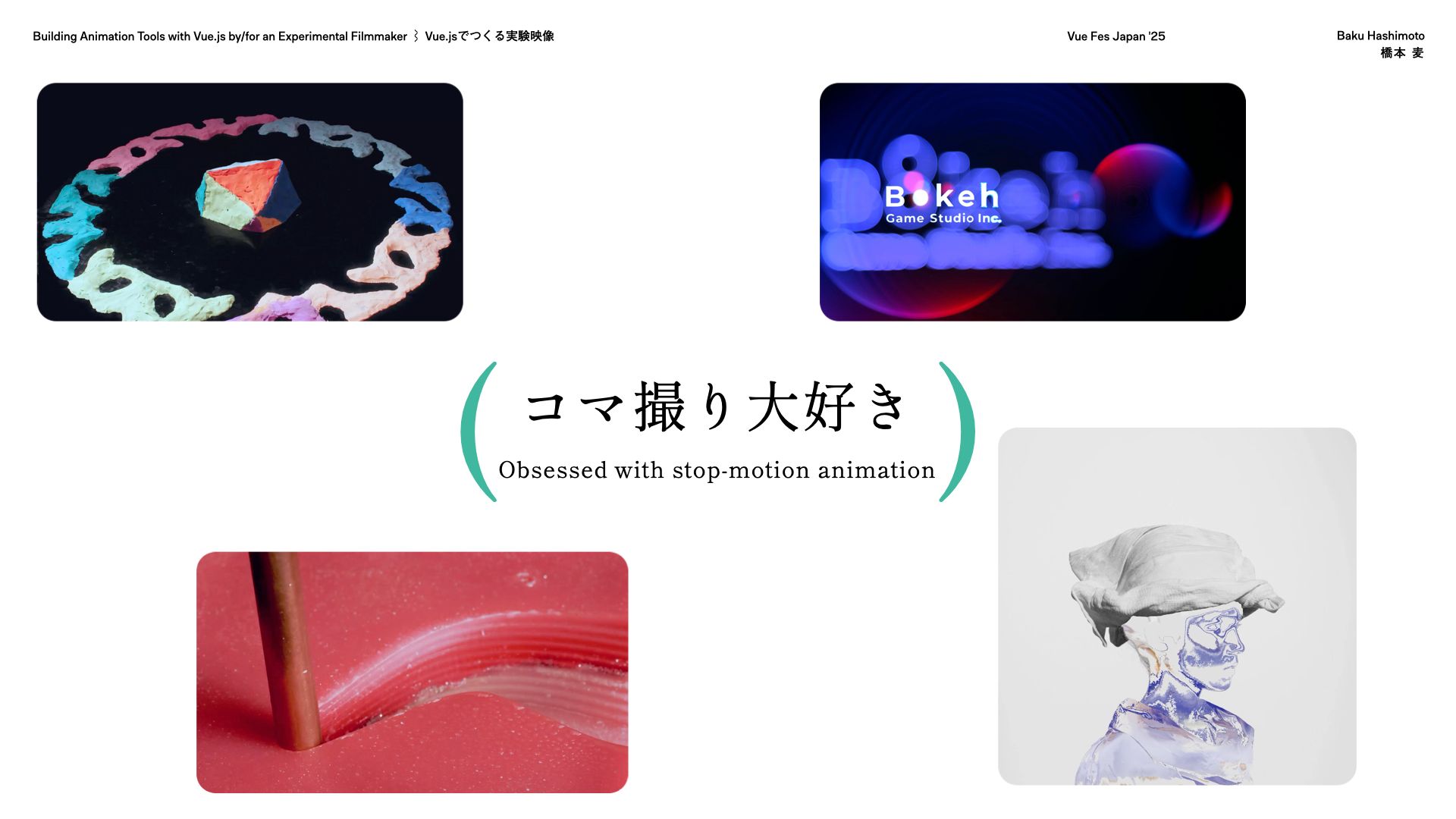 映像作家として、Vue.jsを使って自作のモーショングラフィックス制作ツールやUIライブラリを開発しながら、コマ撮りやミュージック・ビデオづくりを行ってきました。本セッションでは、非エンジニア視点でのVueの活用法、創作フローにおけるGUI開発の役割、そして表現とツール開発が交差する実践例を紹介します。