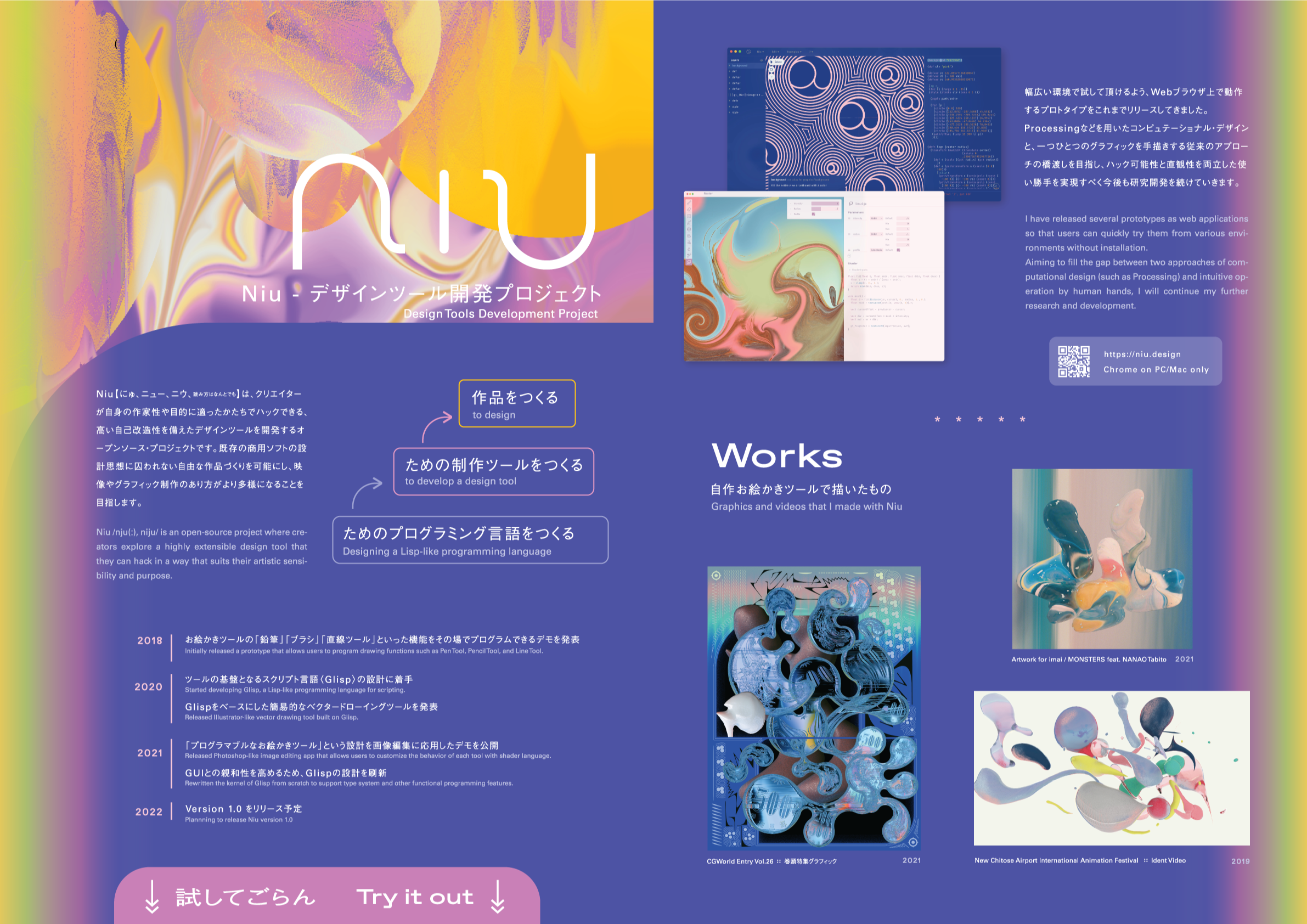 プロジェクト名を「ニュ」とかいうふざけた名前にしたのは、Glispというプログラミング言語名をプロジェクトに冠すると適当な経費を落とせないのではないか、では普段から漫然とやっているツール開発やツール考をまとめてこの屋号に押し込めてしまえ、という下心からです。その心配は杞憂に終わりましたが。今ではniu.design のドメインすら期限切れになっているので、もう忘れて頂いて結構です。
