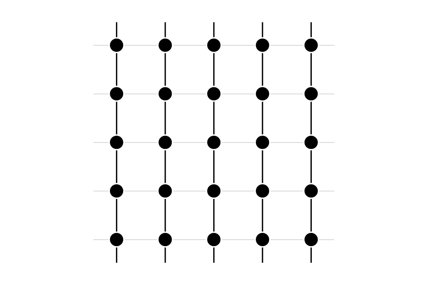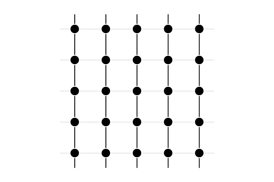 もちは格子状に配置されていて、それぞれ上下左右に 1 つづつ動くことができます。もちの場所を黒丸で表し、移動できる場所同士を線でつなぐとこんなグラフになります。今回の Web サイトでは上下左右がタイル状に反復しているので、両端の黒丸同士も繋がります。