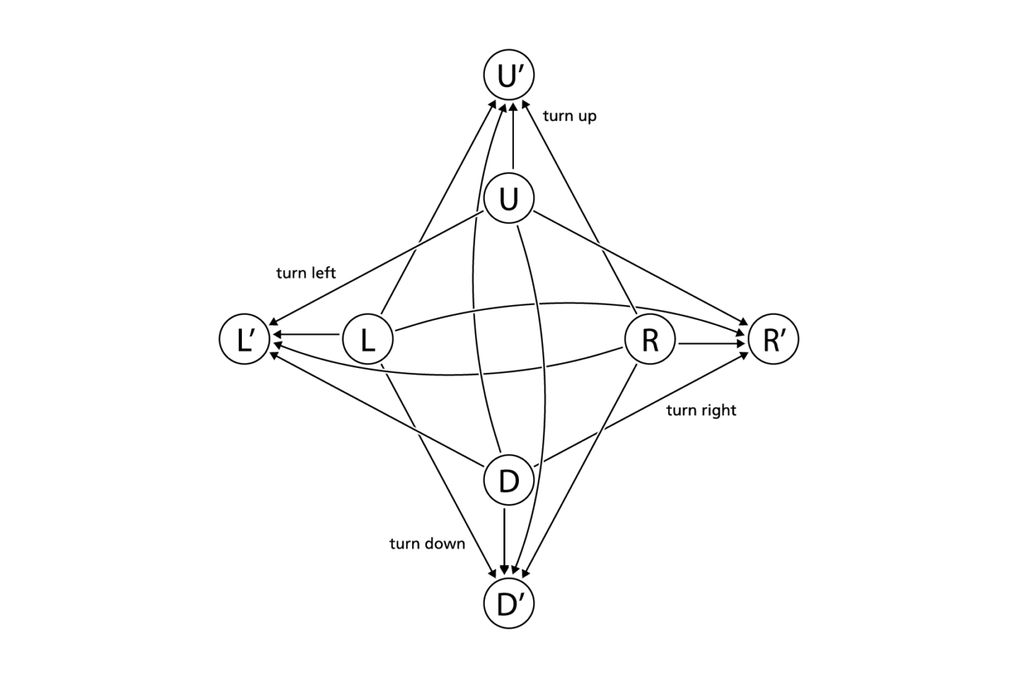 こうしたループを作るのは案外簡単です。まず、もちがぶつからずに動ける「正しい」矢印パターンから始めます。全部のもちが一斉に下に動くのが一番単純でしょうか。一旦移動の向きを忘れて、もちが動く道筋だけを考えます。
