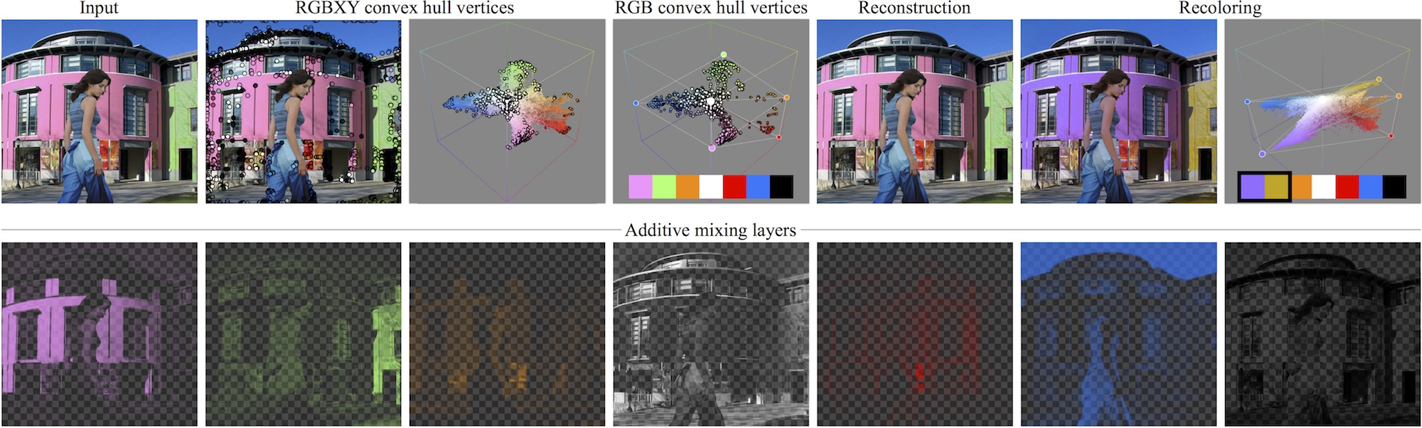 Efficient palette-based decomposition and recoloring of images via RGBXY-space geometry