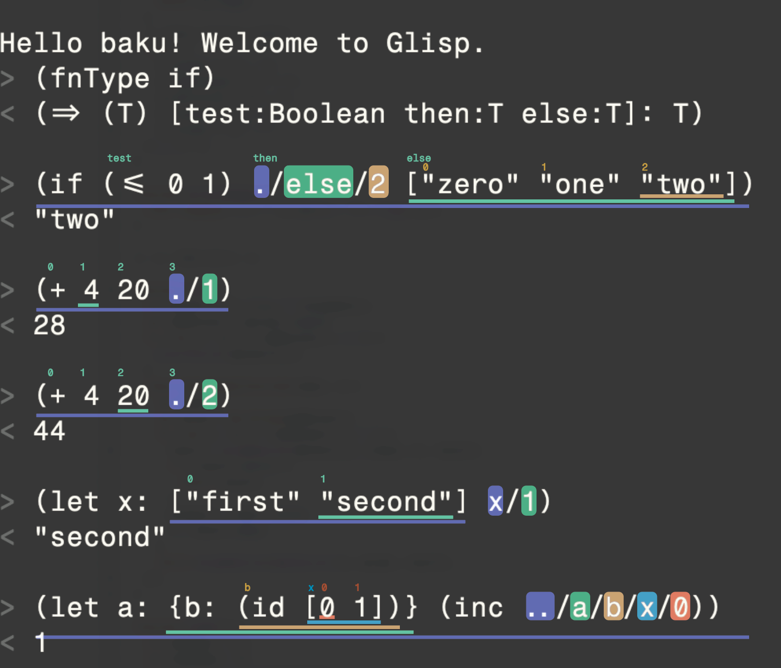 GlispのASTは、すべての式にパスが割り振られています。そのため、let式でシンボルを宣言せずとも以下のように式を相互参照することができます。