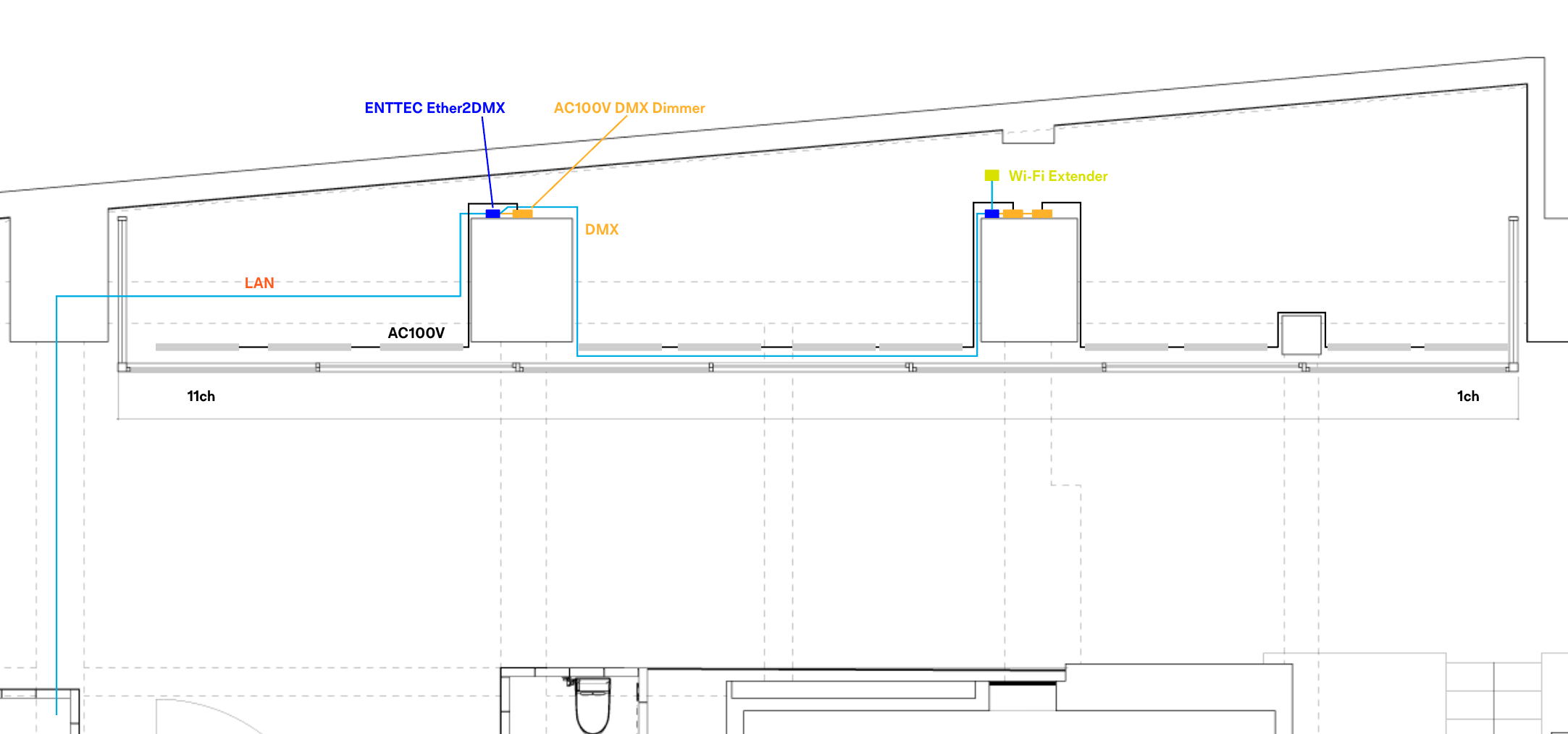 - ギャラリー天井にDMXディマーを取り付けられるコンセントとスペースを確保する