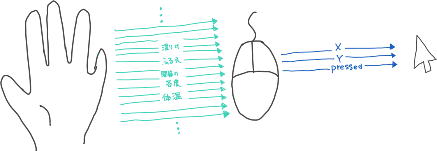 このとき、このユーザー入力に具体的にどのような情報がどのくらい含まれているかを考えてみます。例えば昔ながらの1ボタンマウスは、利き手の20近くの関節が生み出す「(X, Y)という2つの連続量」「クリックされたかどうかの真偽値」というわずか3つのパラメーターに畳み込み、画面上のポインタの動きへと対応づけるUIといえます。