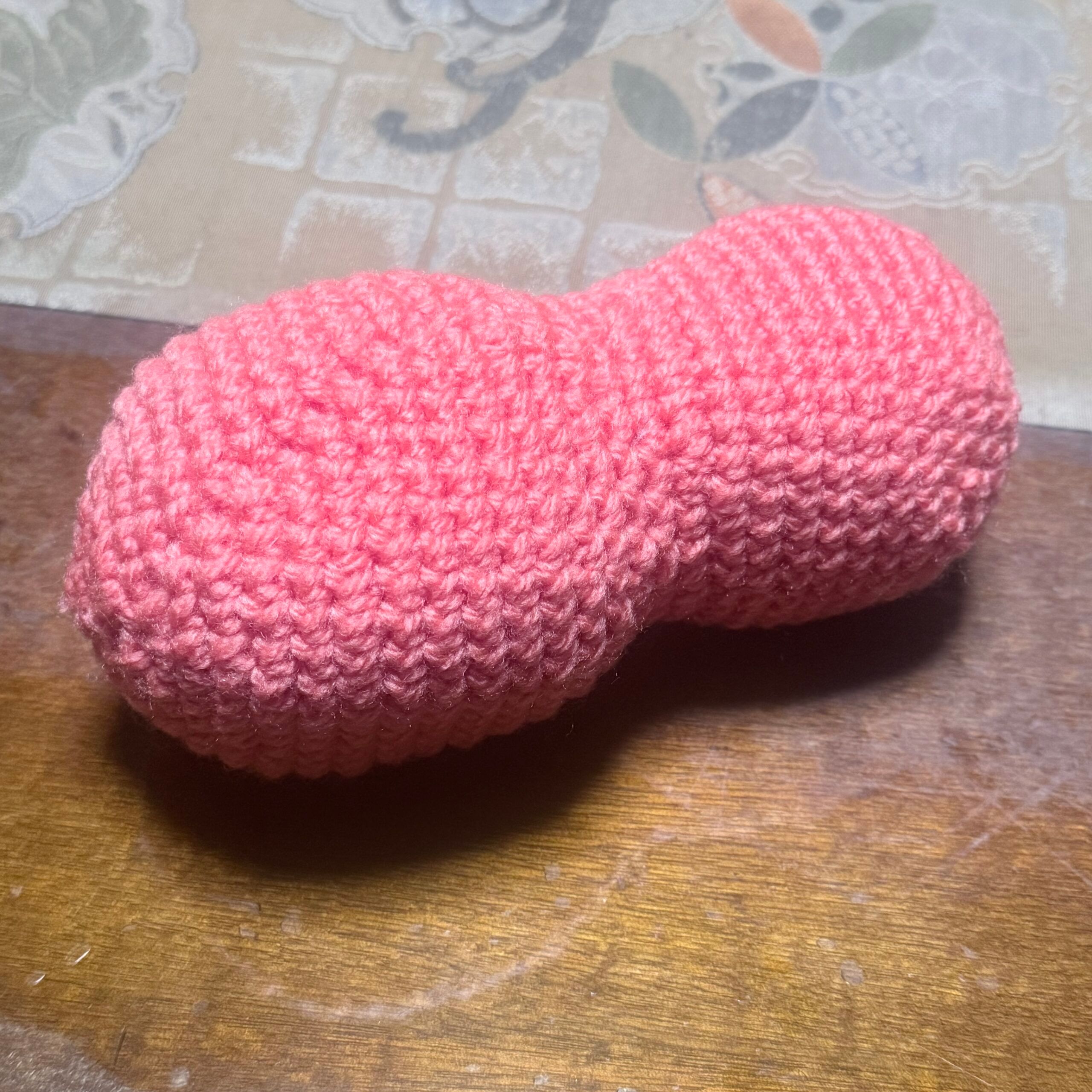 早朝の帰省の飛行機で寝不足になりながら編んでいたら目の数を間違えて左右で違う大きさになった。酸素分子は後付で、球体が編めるようになったので、途中で膨らませて2つにしただけ。