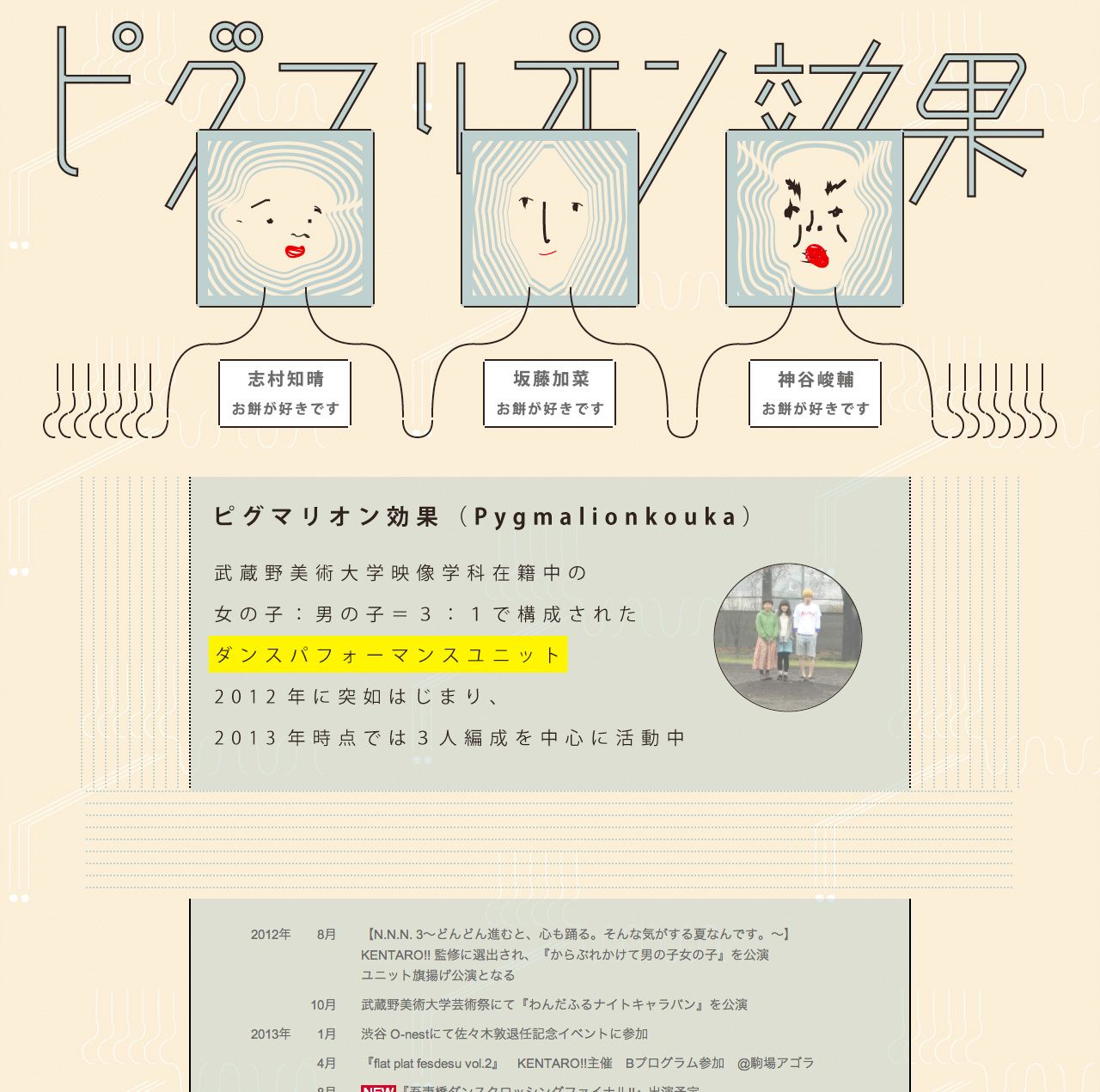 学生の頃、友人のパフォーマンス・ユニット「ピグマリオン効果」の Web サイトを作りました。サイト自体は落ちちゃったけど、メンバーの一人はバスクのスポーツのKamiya、もうひとりは今をときめく映像ディレクターの志村 知晴さんなわけで、ムサビの同級生もみんな活躍していてすごいなぁ。